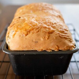 - Bake: Bake for 32-40 minutes, until the loaf is golden brown and sounds hollow when tapped (or hits 190°F/88°C internally if you have a thermometer). If the cheese on top browns too quickly, tent with foil after 25 minutes.