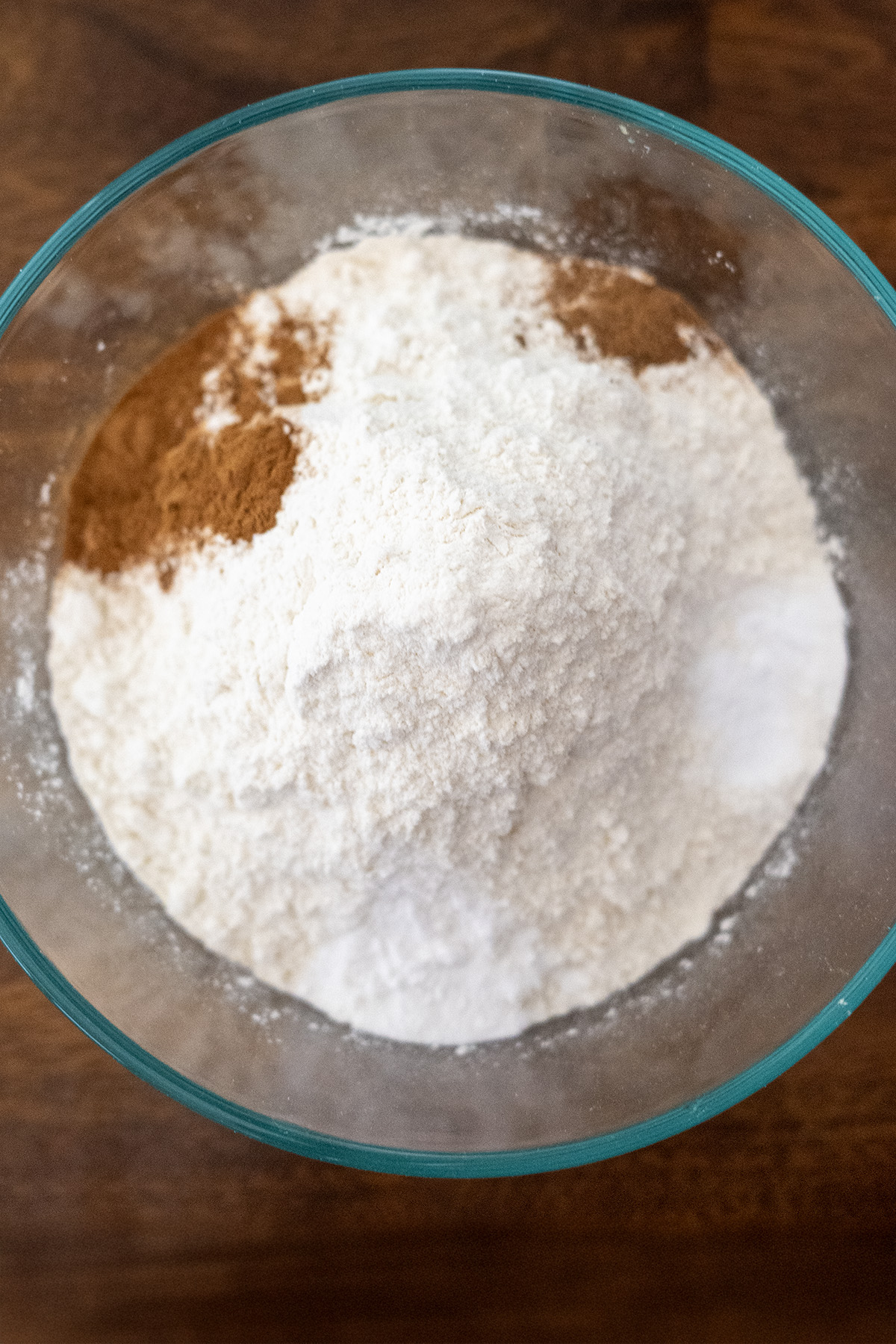 - Mix Dry Ingredients: In a medium bowl, whisk together flour, baking soda, baking powder, salt, cinnamon, and nutmeg. Set aside.