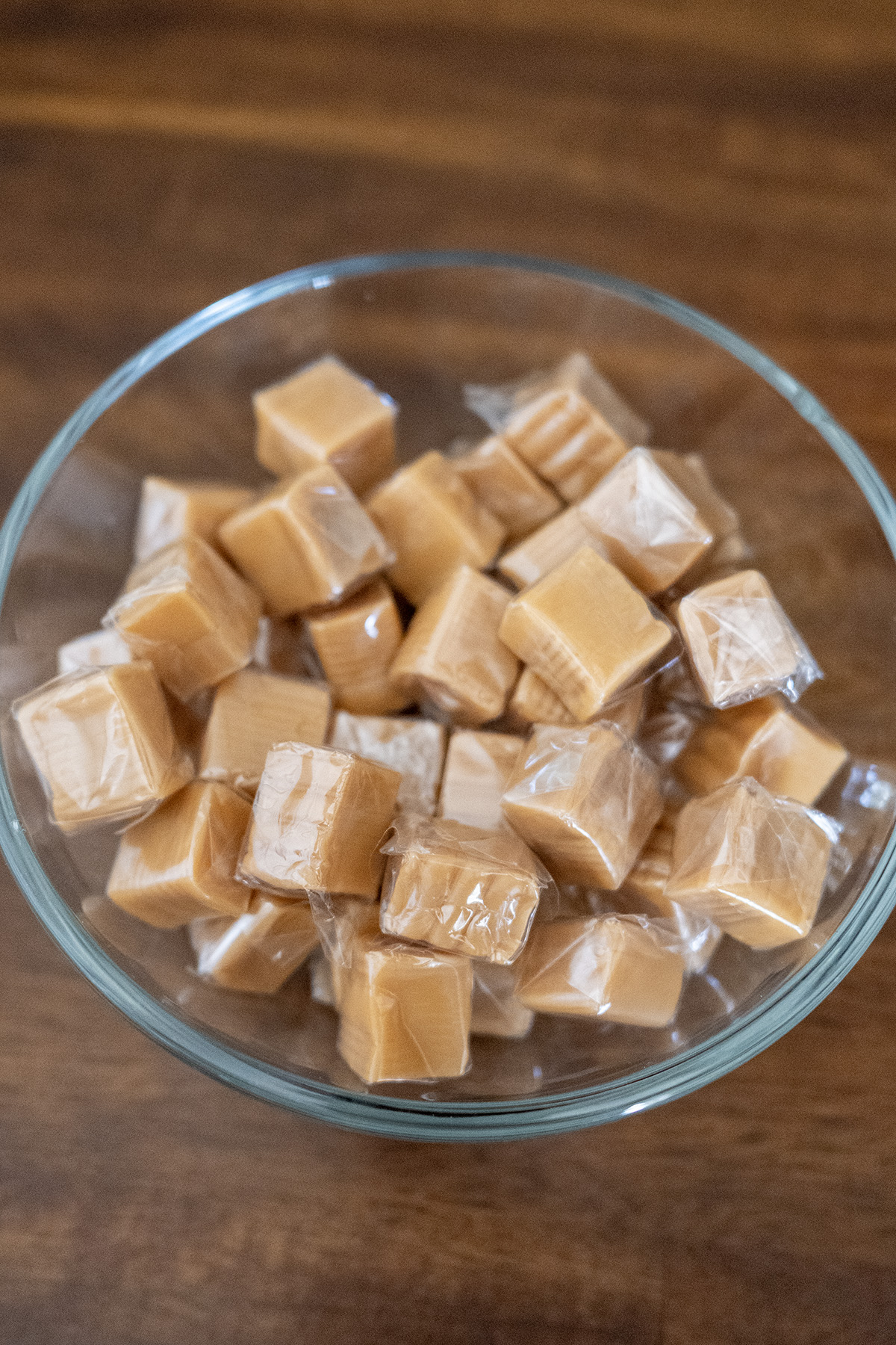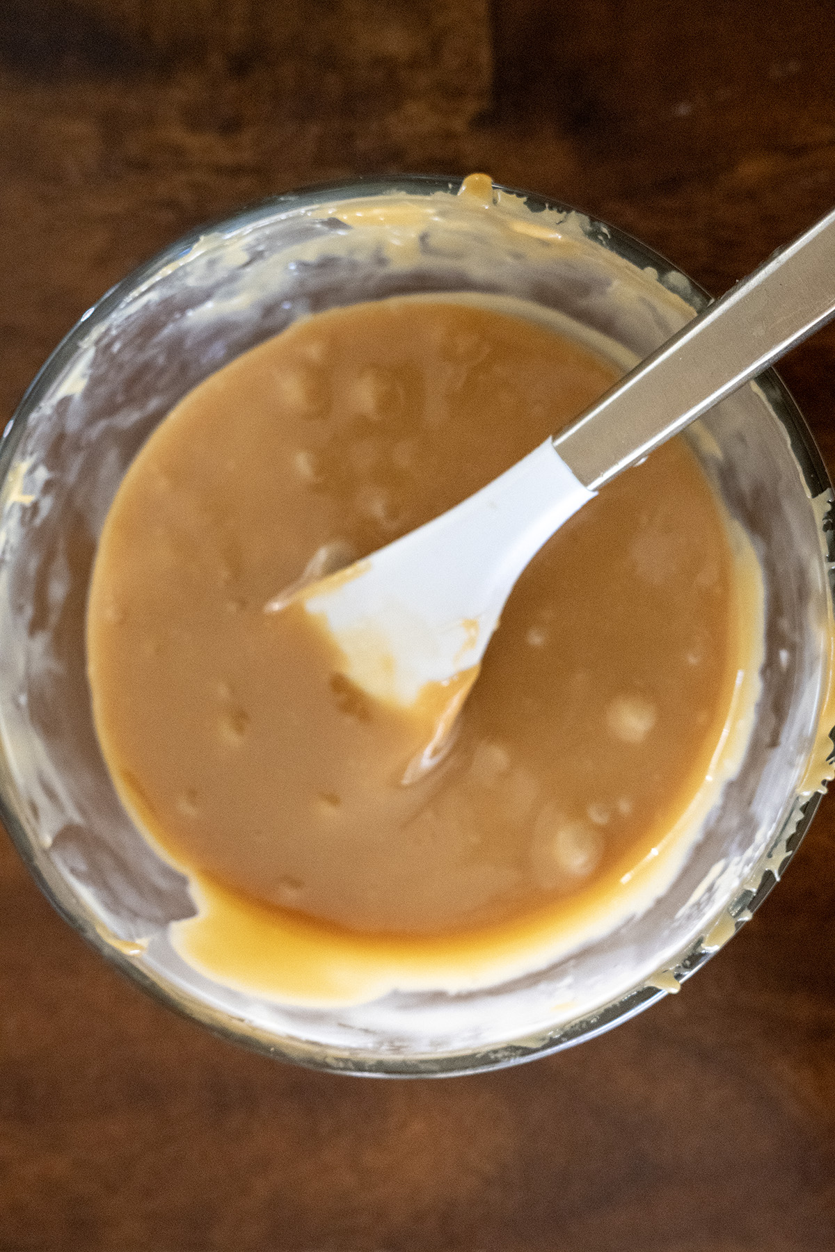 - Melt Caramel: In a microwave-safe bowl, combine caramel squares with 1–2 tablespoons of heavy cream. Microwave in 15-second bursts, stirring between each, until smooth and drizzleable (about 45–60 seconds total).