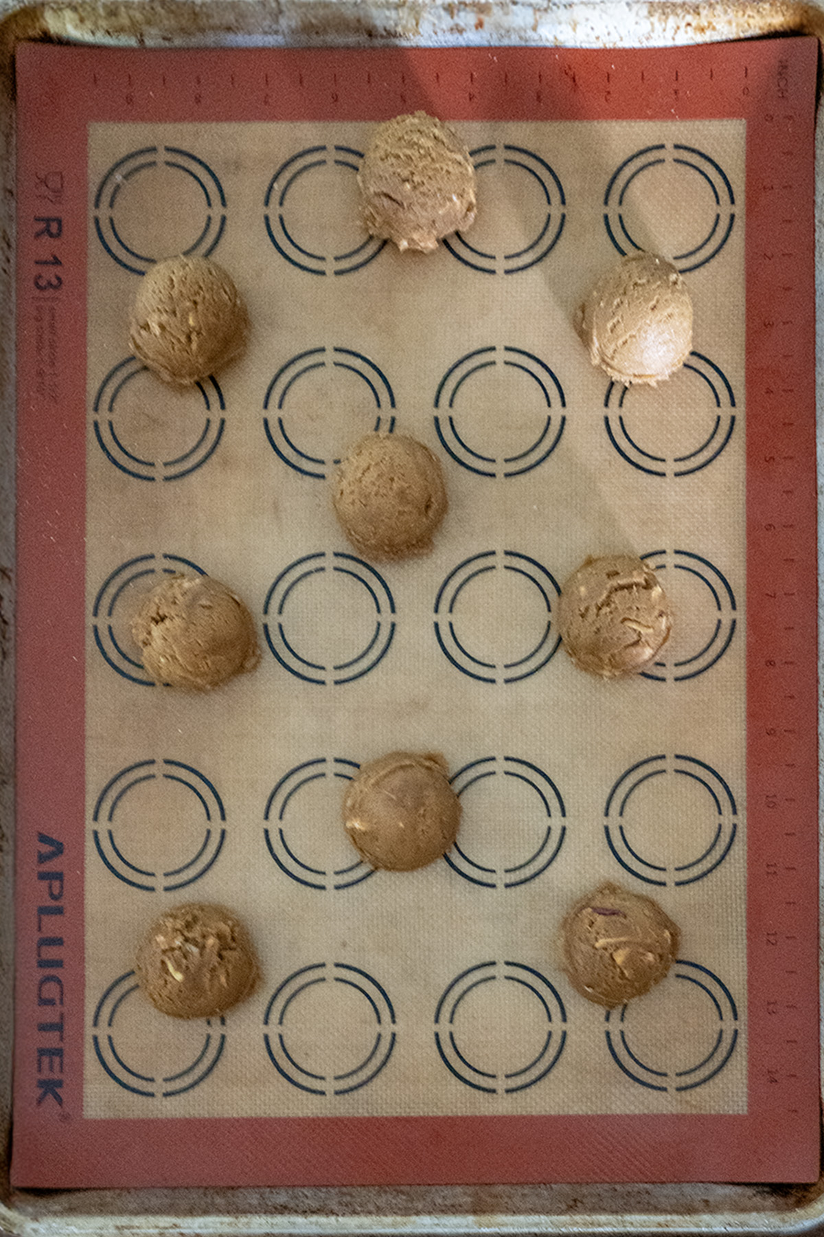 - Shape Cookies: Scoop dough into 1½-tablespoon balls (should yield about 30 cookies). Place 2 inches apart on prepared baking sheets.