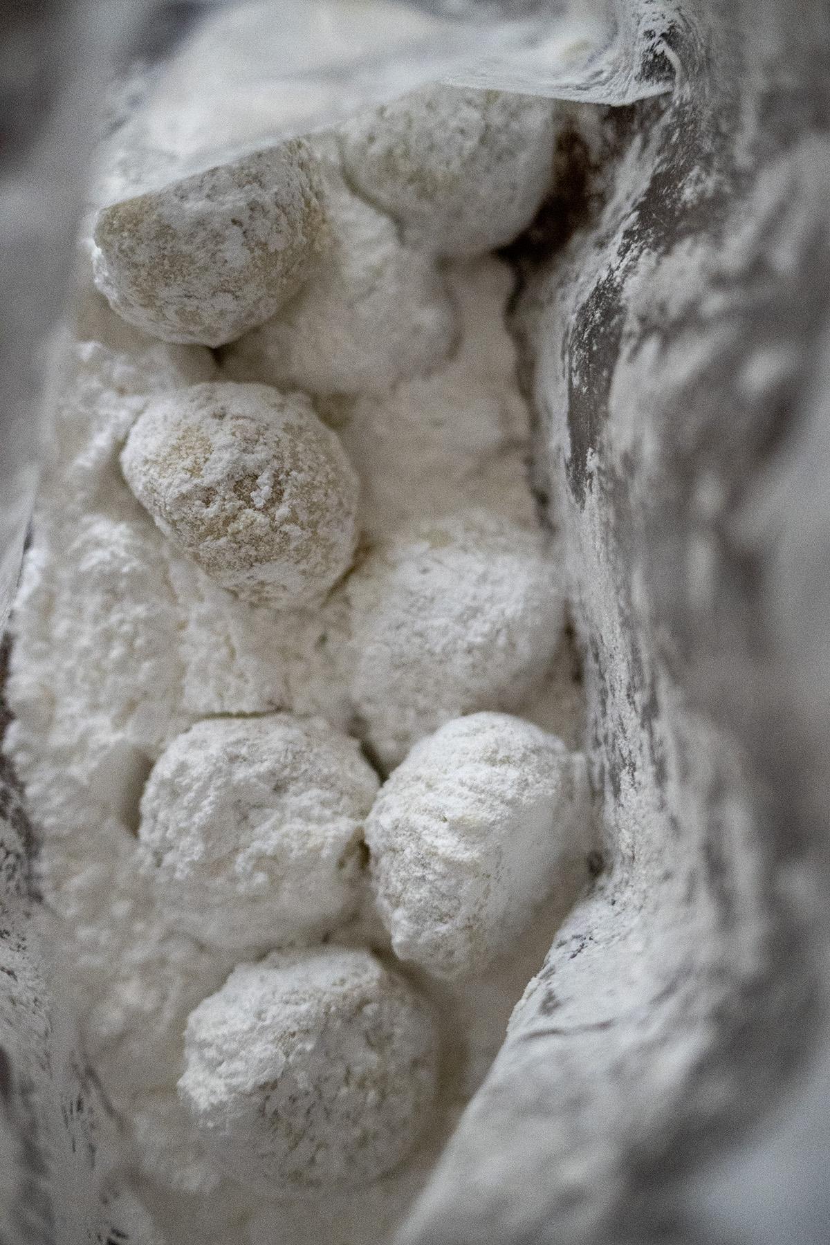 • Coat with sugar: Let the cookies cool for just 5 minutes (they should still be quite warm). For the classic double coating, first place the warm cookies in a large zip-top bag with about 1½ cups powdered sugar, seal, and gently shake to coat evenly. Remove and let cool completely on a wire rack. Once cooled, repeat: add more powdered sugar to the bag (or a fresh batch) and shake again for that extra thick, snowy layer.