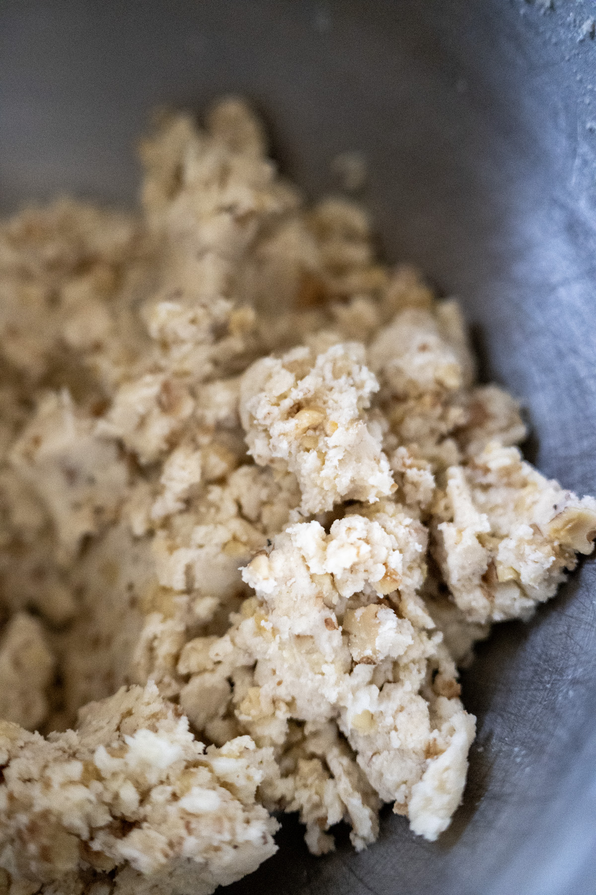 • Add dry ingredients: Whisk flour and salt together, then gradually mix into the butter mixture on low speed. Stir in the toasted nuts. The dough might look crumbly at first but will hold when pressed—or come together smoothly, depending on butter temperature.