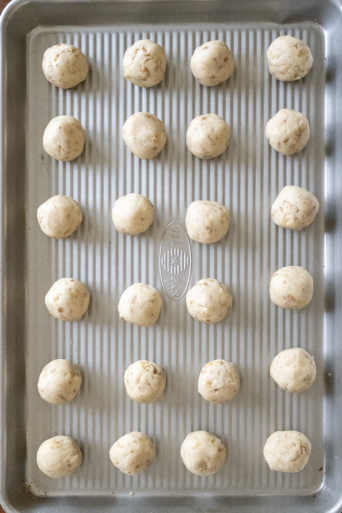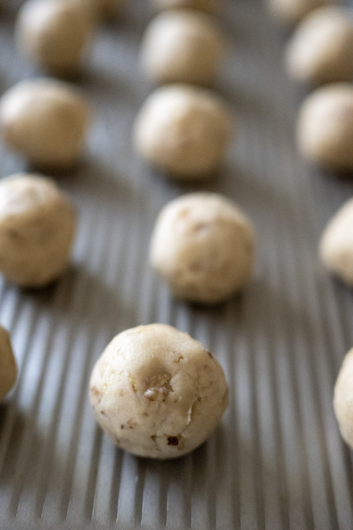 • Shape the balls: Roll tablespoon-sized portions into 1-inch balls and place on baking sheets.