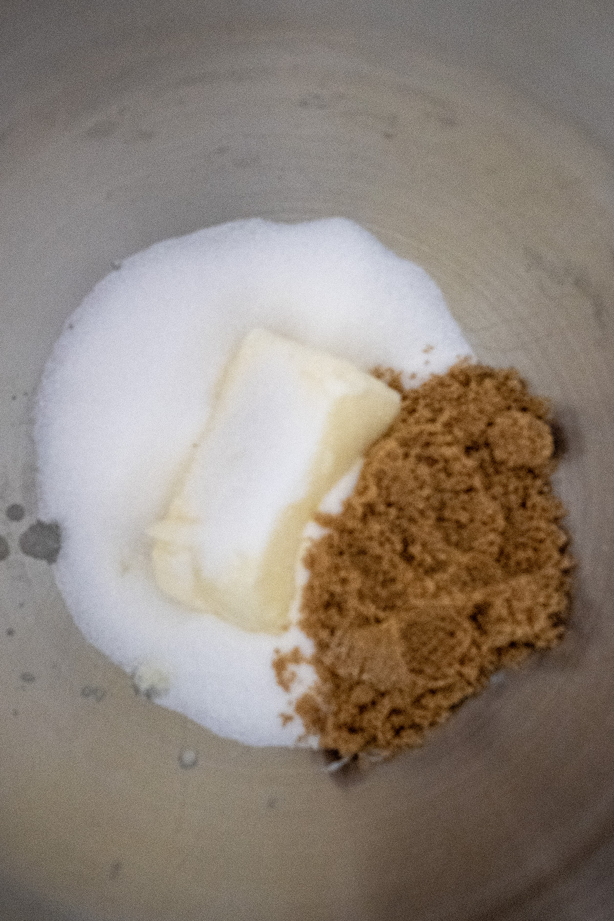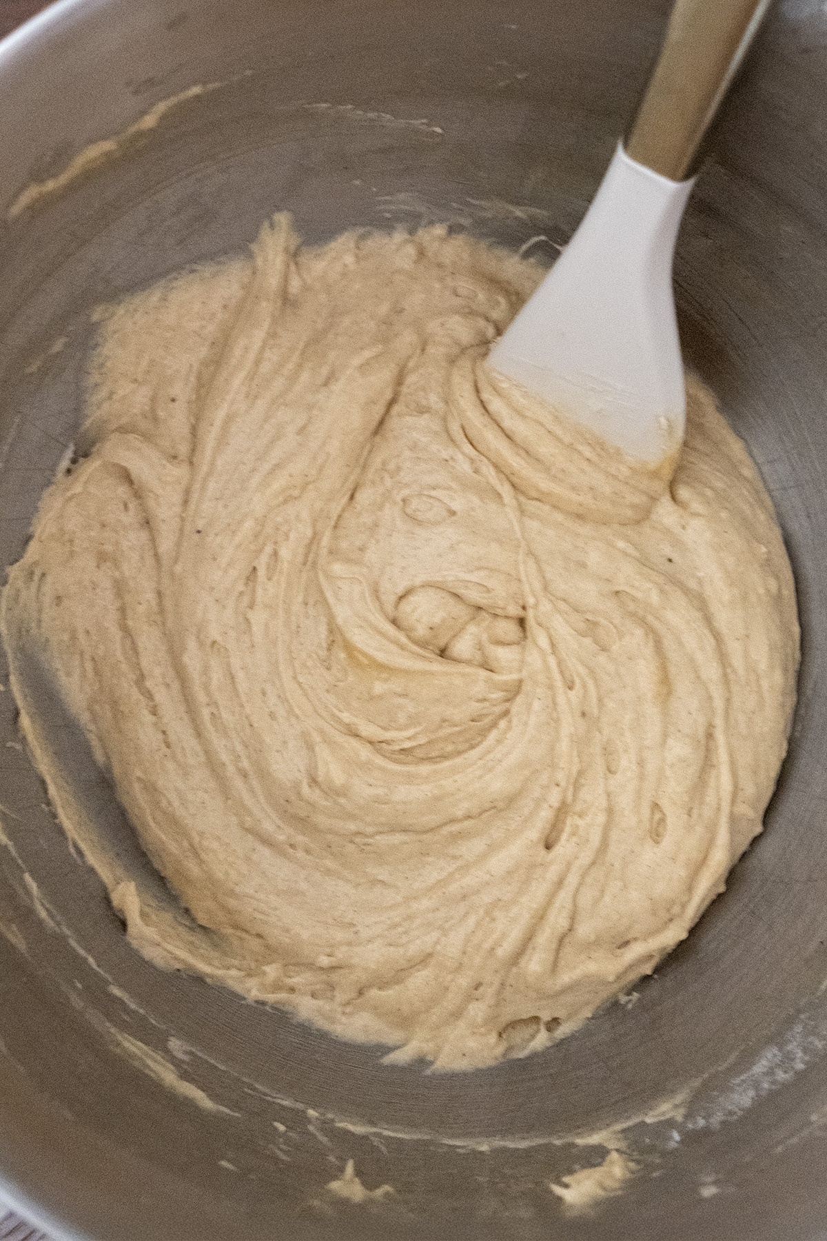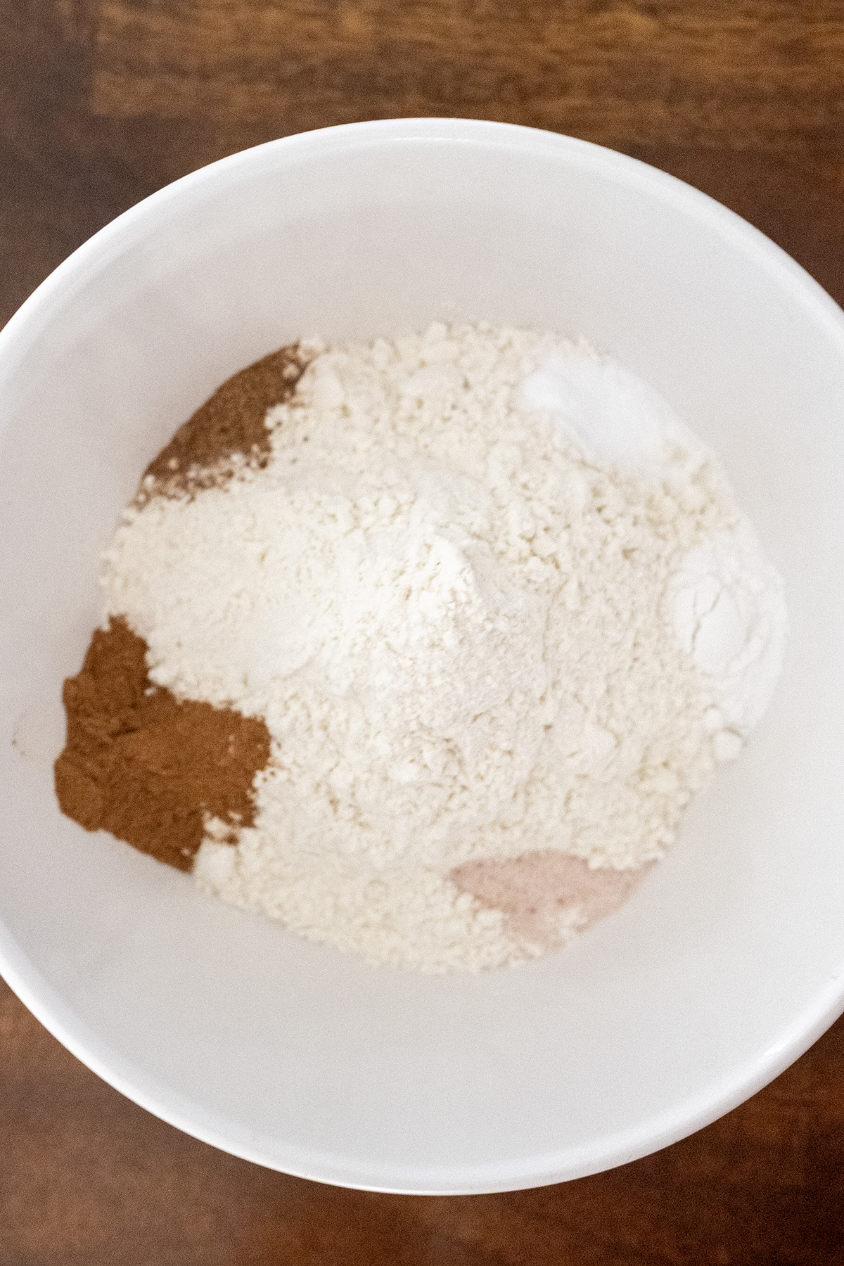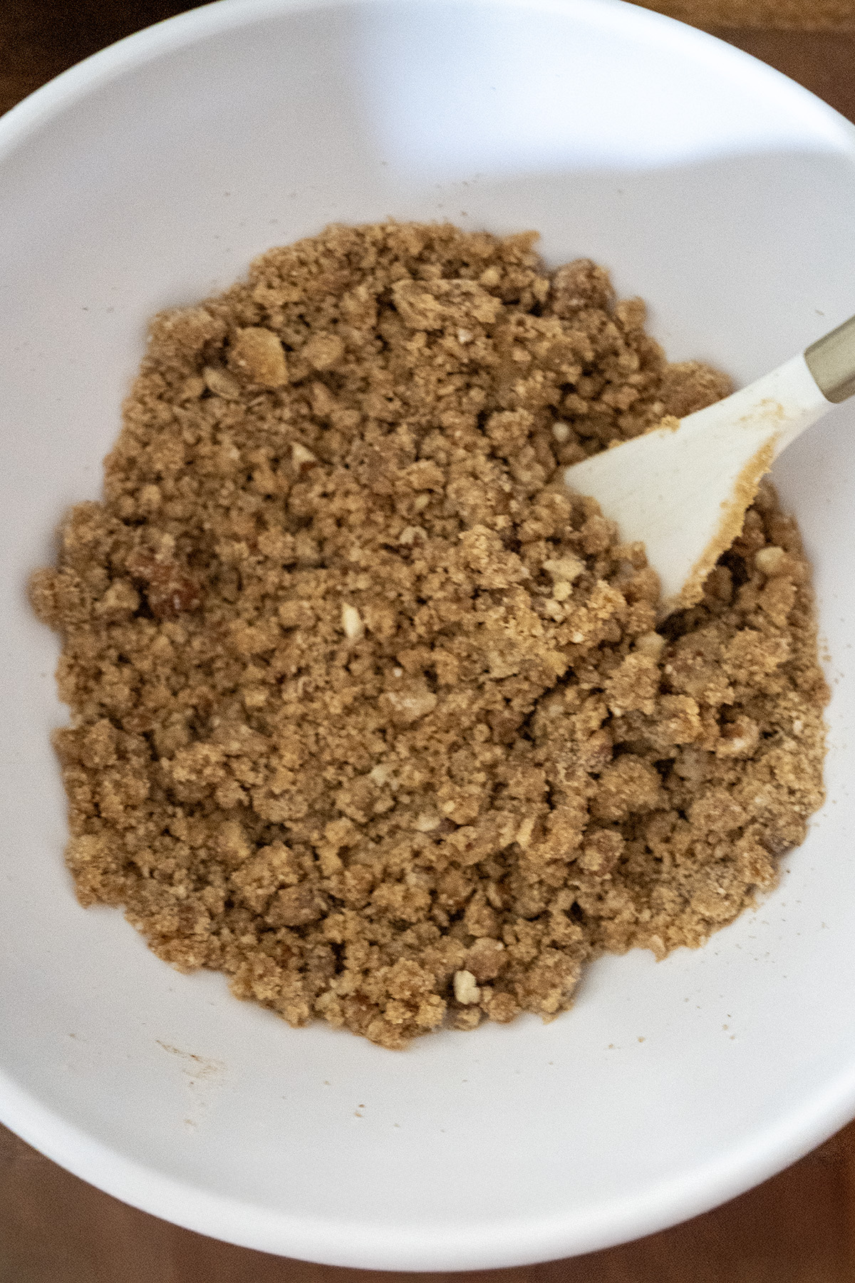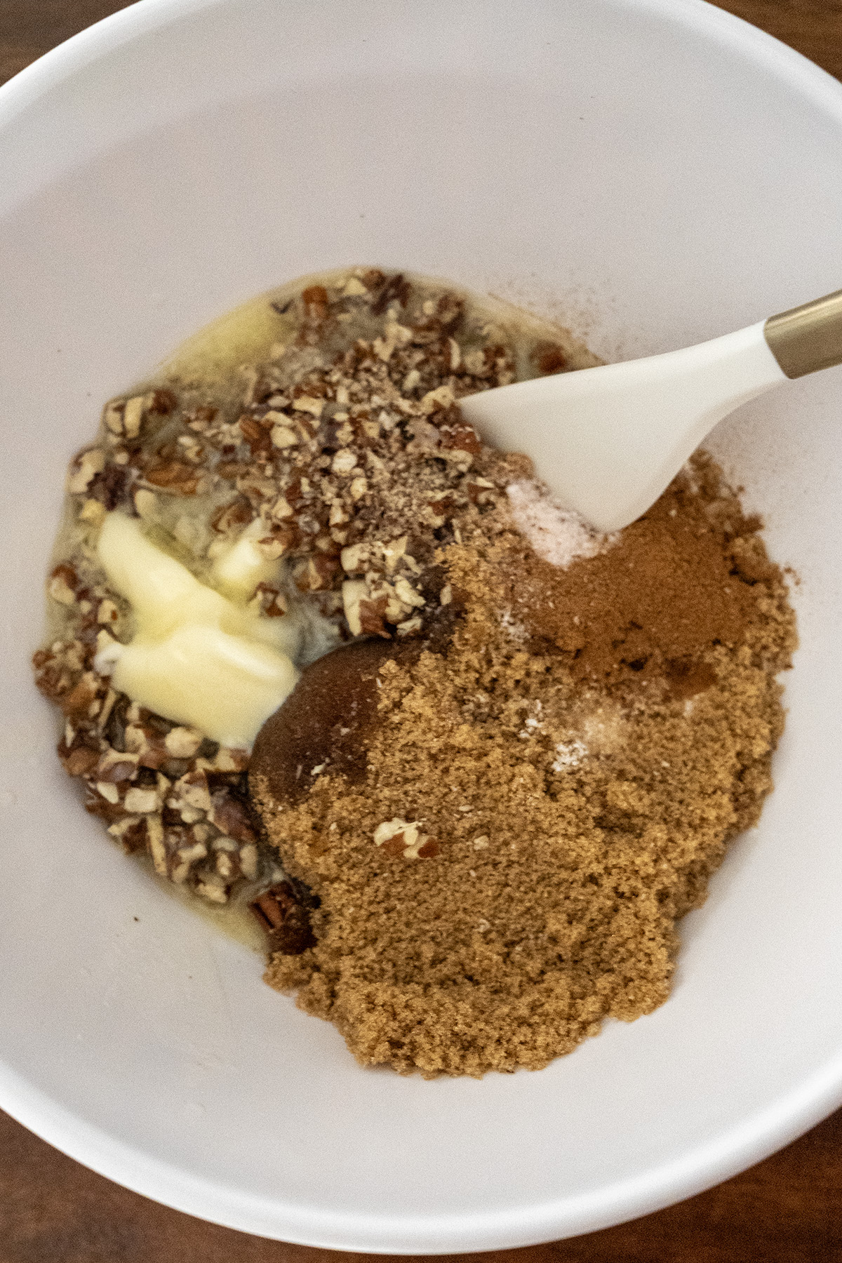 - Make the Streusel Topping: In a medium bowl, mix flour, brown sugar, cinnamon, and salt. Stir in melted butter until the mixture forms coarse crumbs. Add chopped pecans or walnuts and set aside.