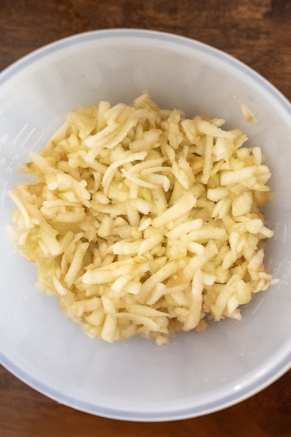 - 2 cups tart apples, peeled, cored, and grated (large hole) 300g (about 2 medium apples)