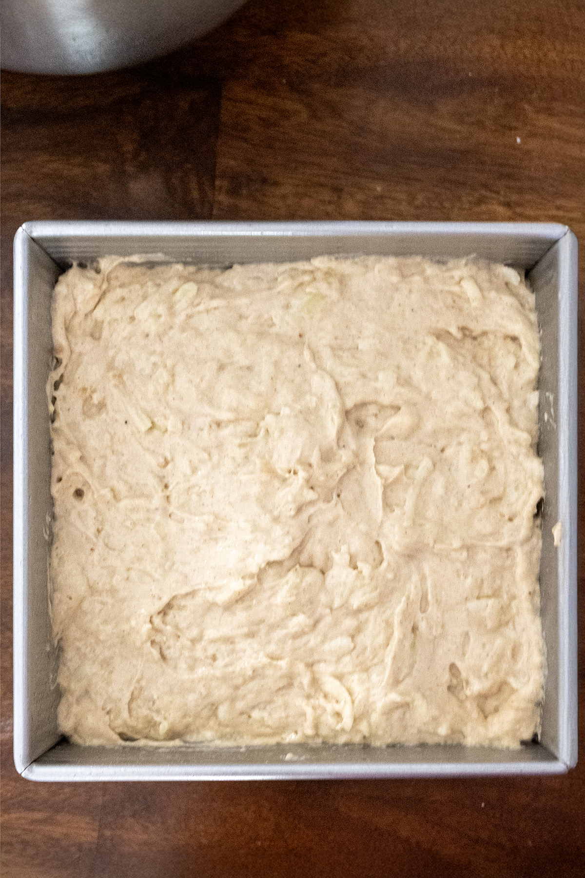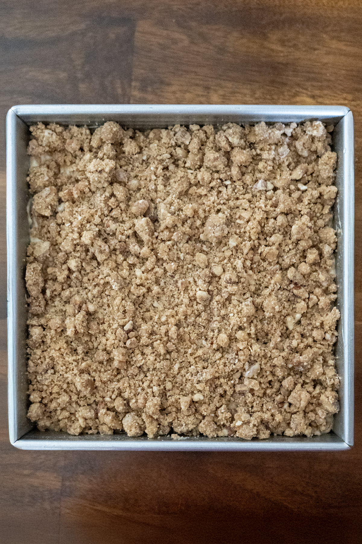 - Assemble the Cake: Spread the batter evenly into the prepared pan. Sprinkle the streusel topping over the batter.