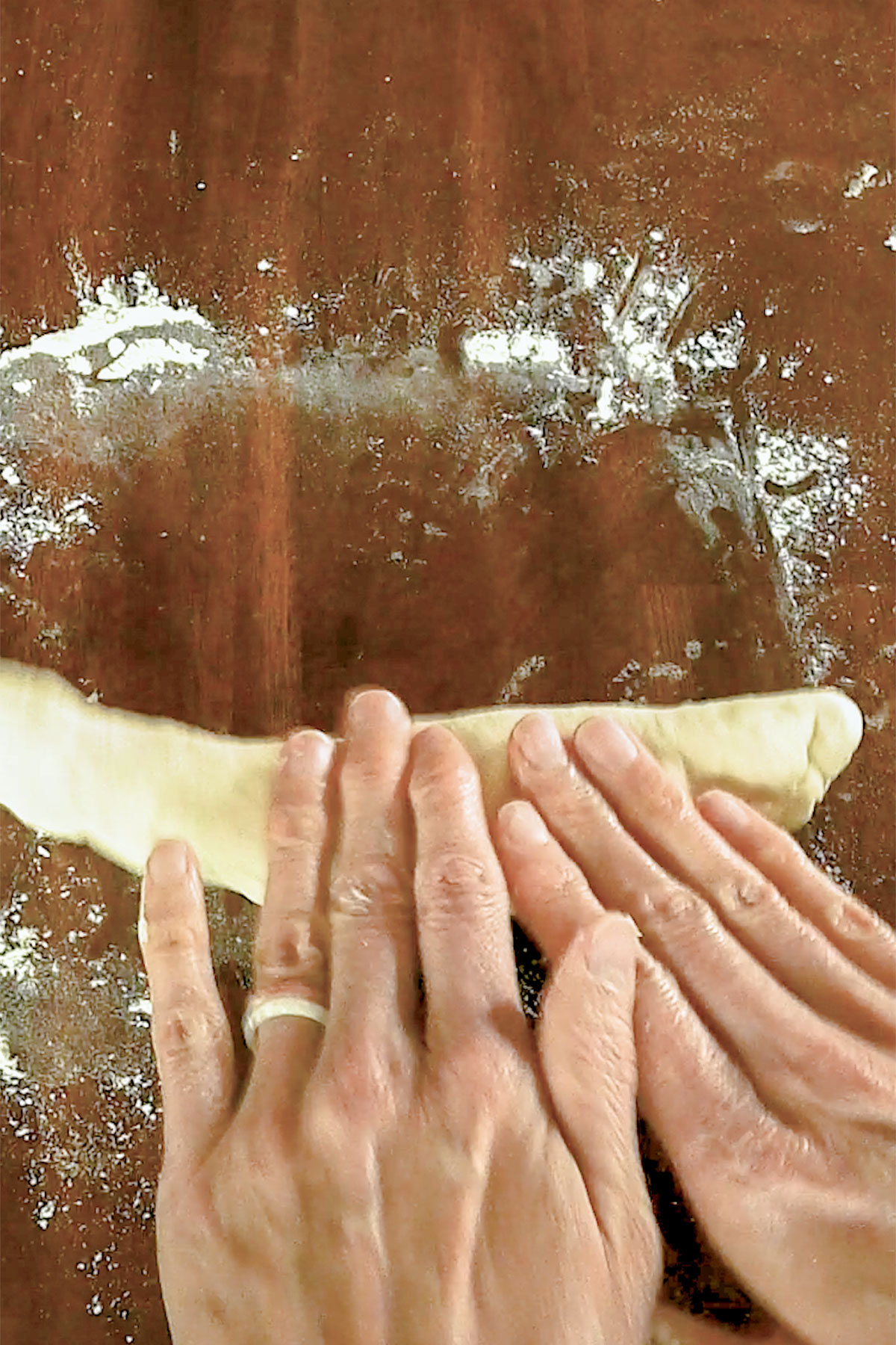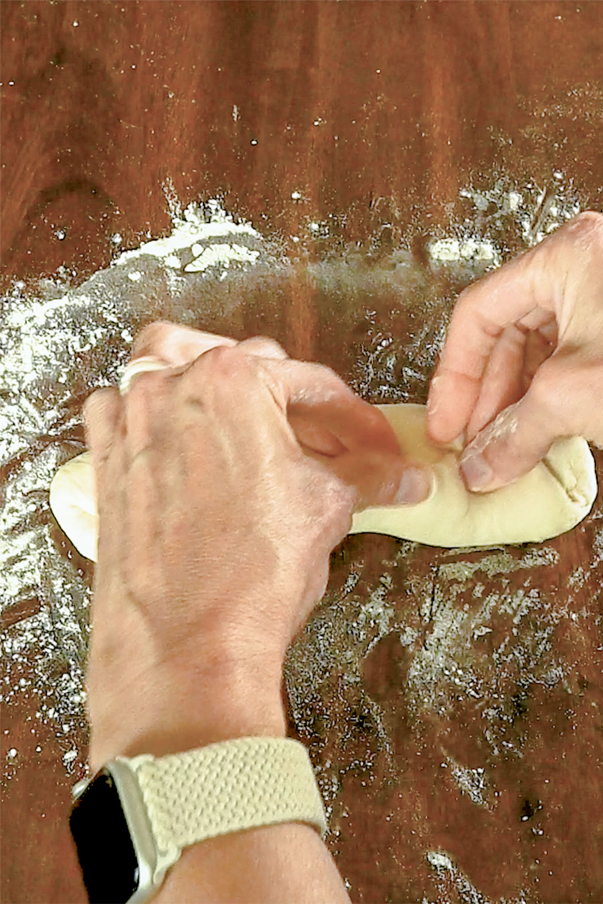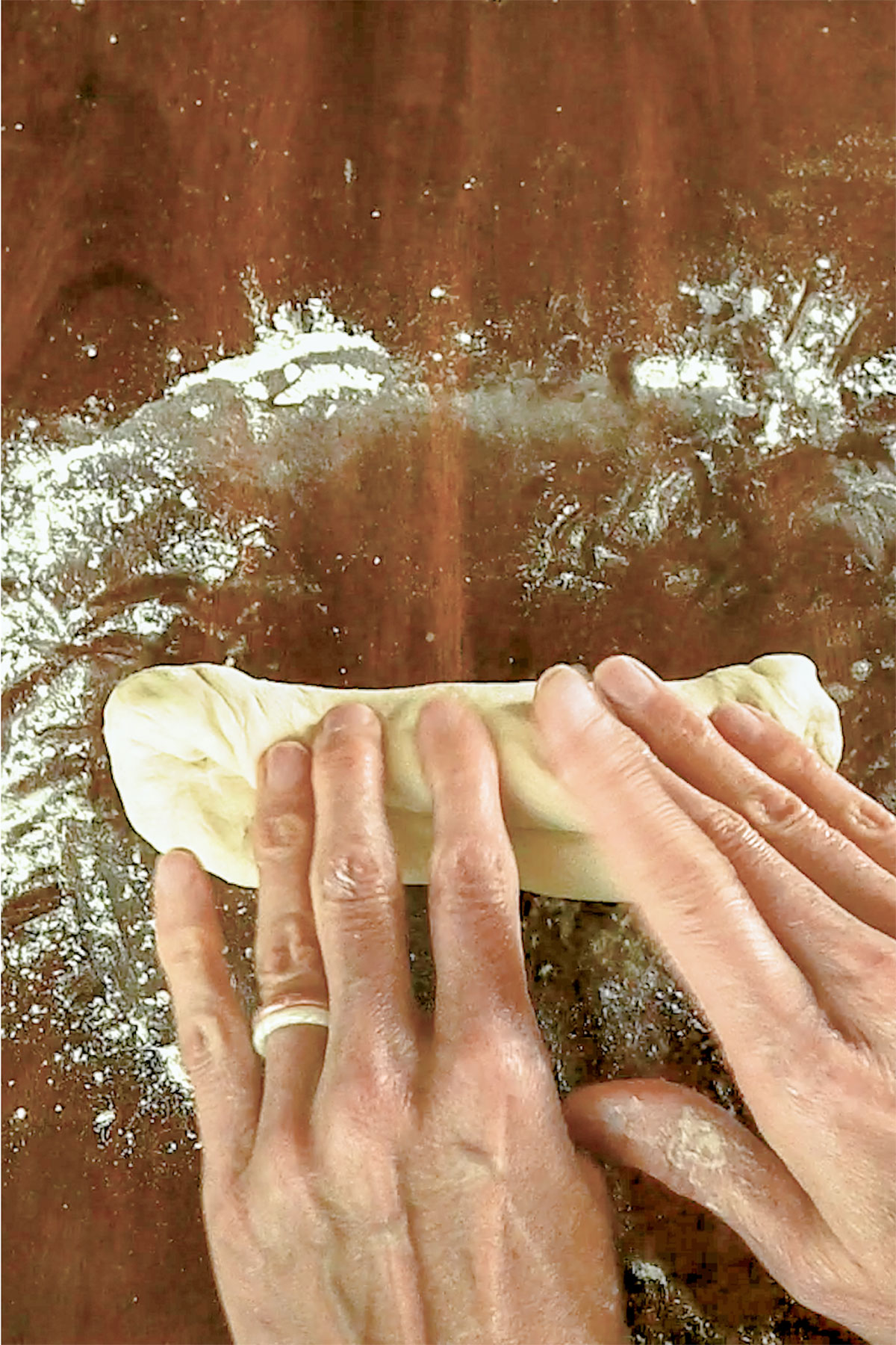 - Punch down dough and divide into 6 equal pieces. Shape into ovals: flatten, fold edges in, roll tightly, and pinch seams. Place seam-side down on a parchment-lined baking sheet or metal baguette tray, 2 inches apart.