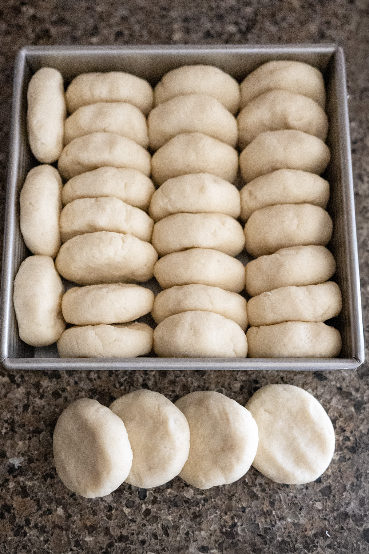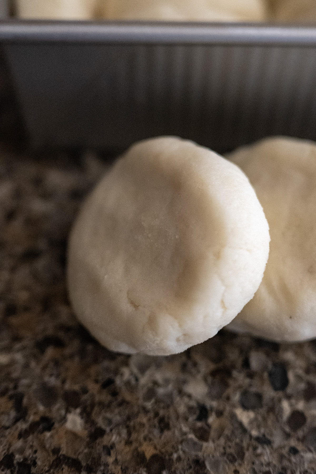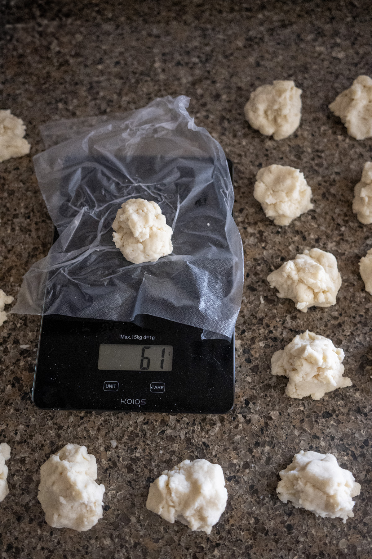 - Shape the Dough: Form the dough into golf-ball-sized portions (60g each is ideal). Gently flatten each ball into a disc and place them in a baking pan. Cover with plastic wrap or a clean kitchen towel and refrigerate for at least 30 minutes (up to 3 hours) to let the dough rest for better texture.
