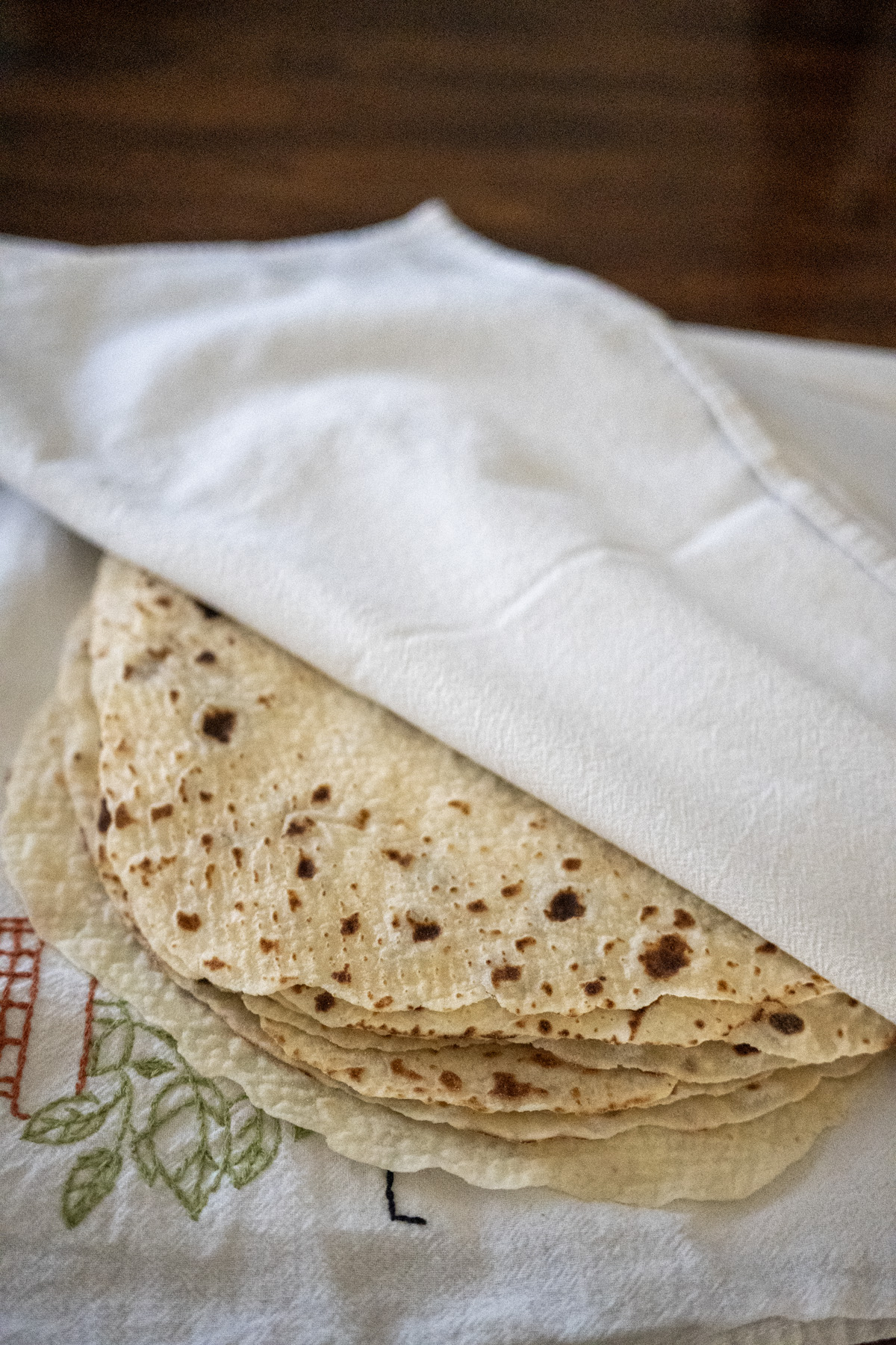 - Cook the Lefse: Carefully transfer each round to the hot grill using a lefse turning stick. Cook for 1½–2½ minutes per side (longer at lower temps), until very light golden spots appear. The lefse should still be soft and pliable. Lay cooked lefse on a tea towel to cool. (do not stack while warm). As you work and lefse cools, transfer to a stack of cooled lefse for folding and storing later.