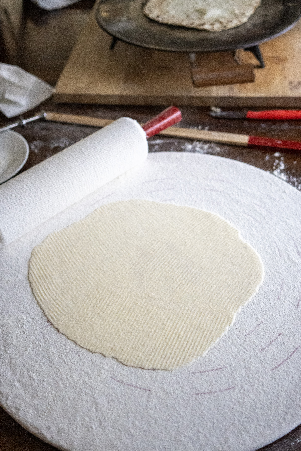 - Roll Out Lefse: On a floured pastry board with a cloth, use a corrugated rolling pin (covered with a rolling pin sock) to roll each dough disc into a thin, 12-14-inch round. Keep the board and pin lightly floured to prevent sticking.