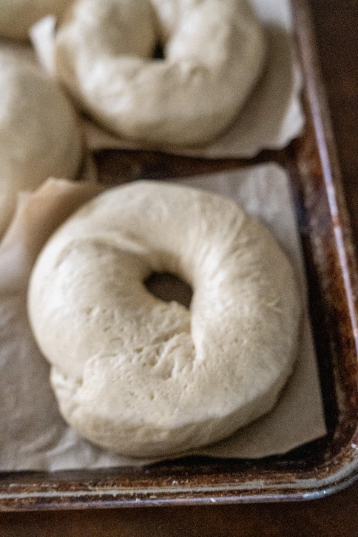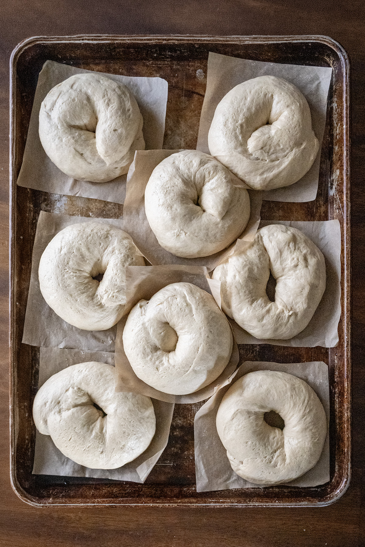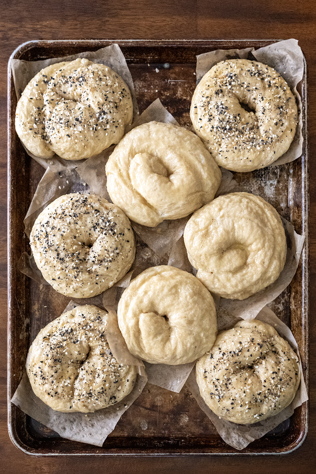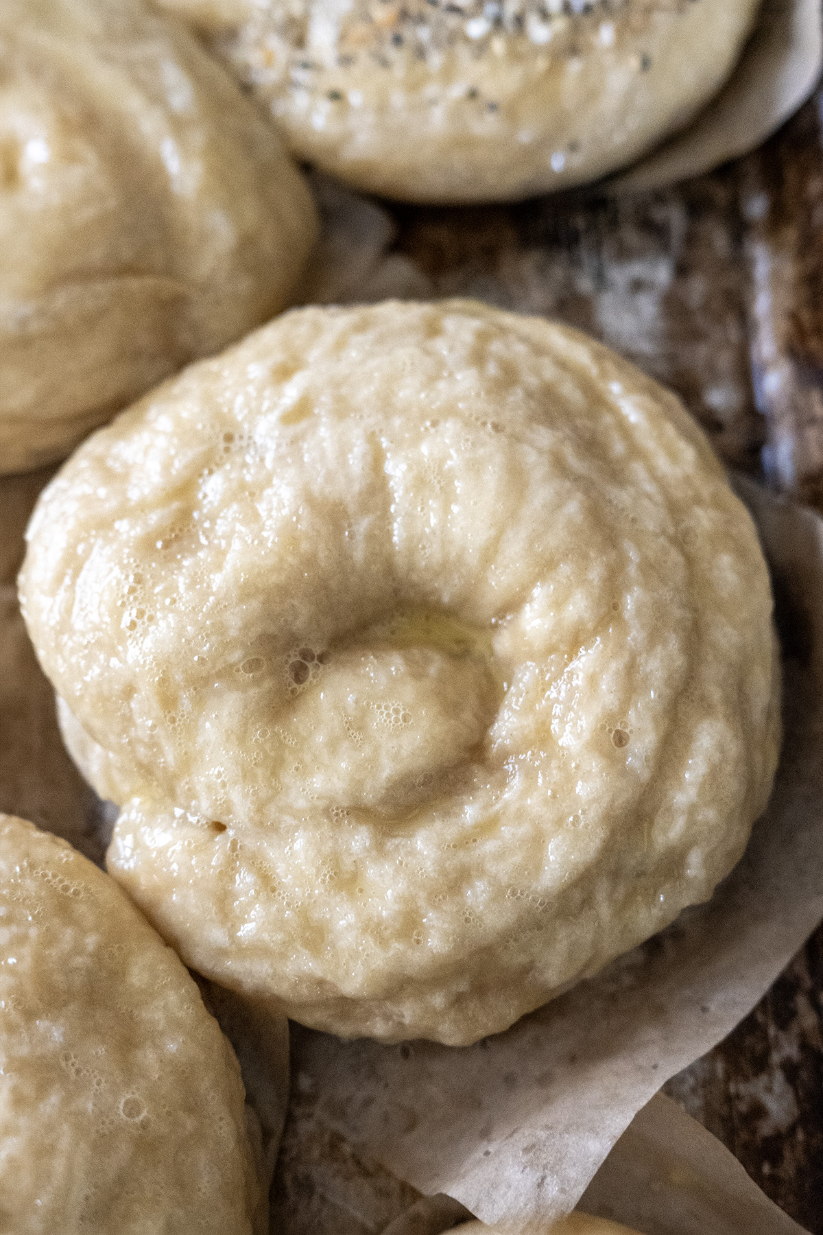 - Cold-Proofing Recommendation: For the best flavor and structure, shape the bagels, place on parchment squares, cover tightly with plastic wrap, and refrigerate 8–24 hours (overnight is ideal). The slow rise builds deeper, more complex taste (richer, tangier, maltier), taller domes, less bottom discoloration, and slightly more open crumb while keeping classic bagel chew. Same-day proofed bagels are great, but cold-proofed are noticeably better—especially if you want fresh bagels over multiple days. If they overproof and flatten slightly, just reshape gently and let rise a bit before boiling.