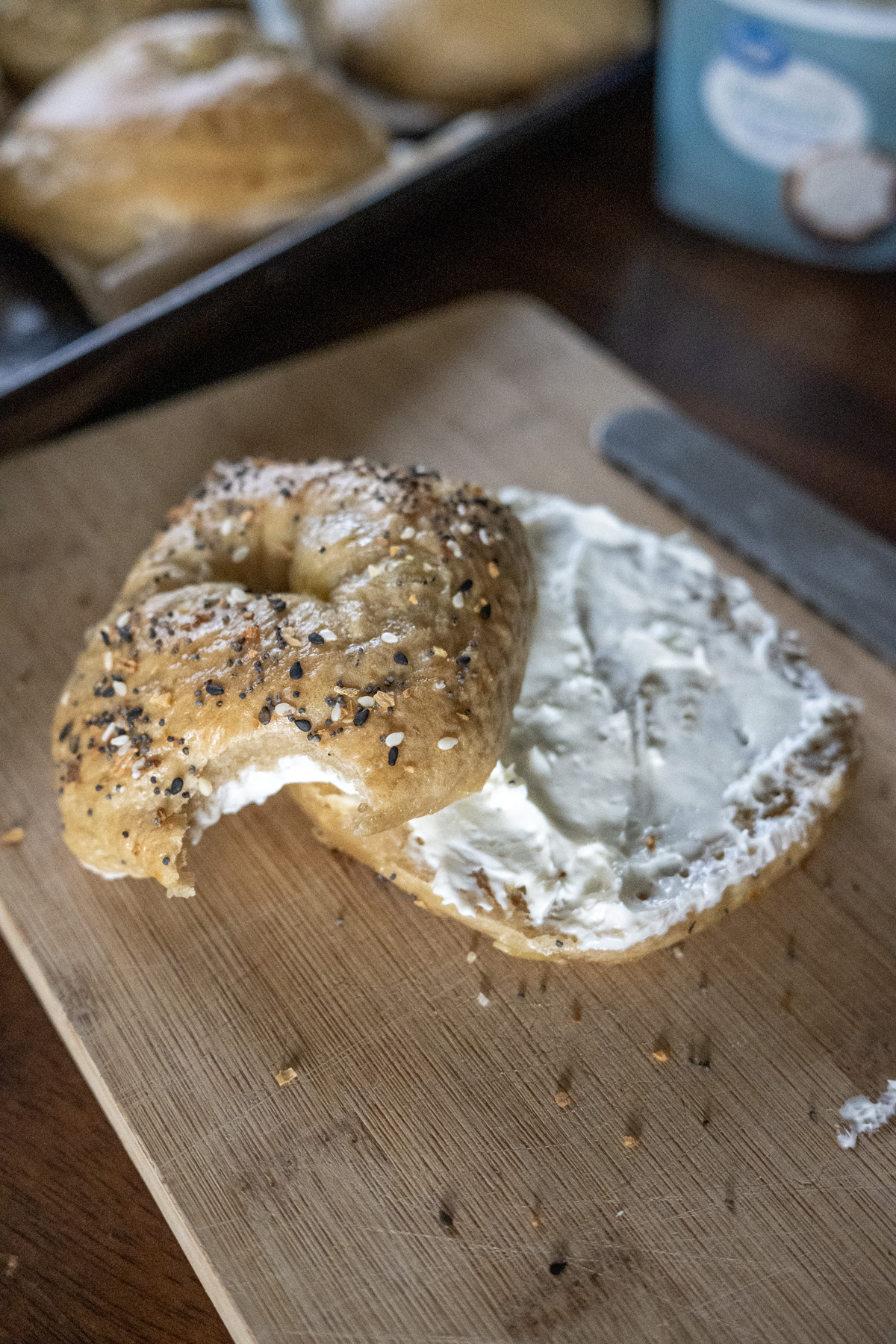 One of the best parts of homemade bagels is piling on toppings—it’s where you can truly make them your own! I frequently use my go-to homemade everything bagel seasoning (a mix of sesame seeds, poppy seeds, dried minced garlic, dried minced onion, and flaky sea salt. It adds that irresistible crunchy, savory, garlicky punch that pairs perfectly with the chewy bagels.