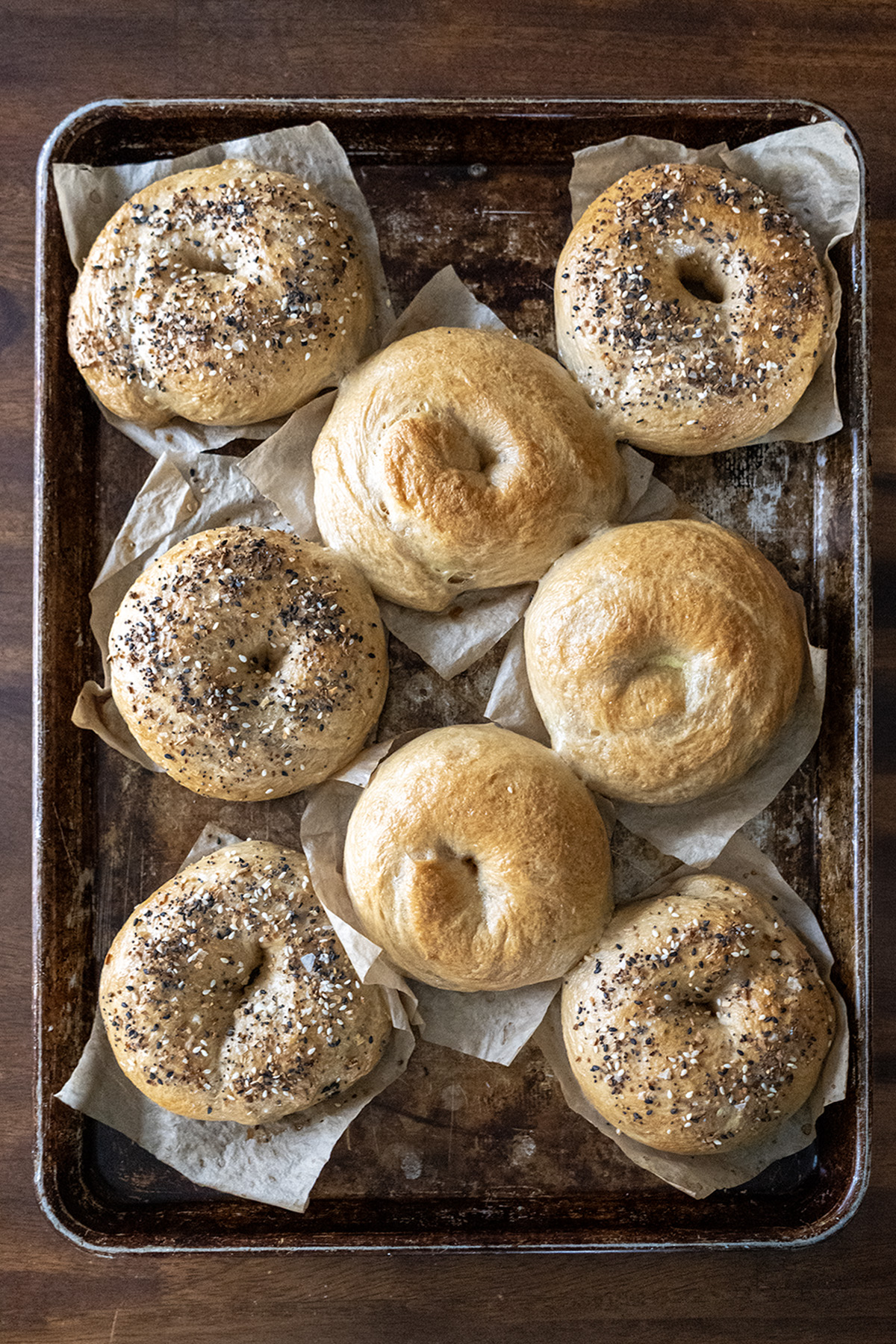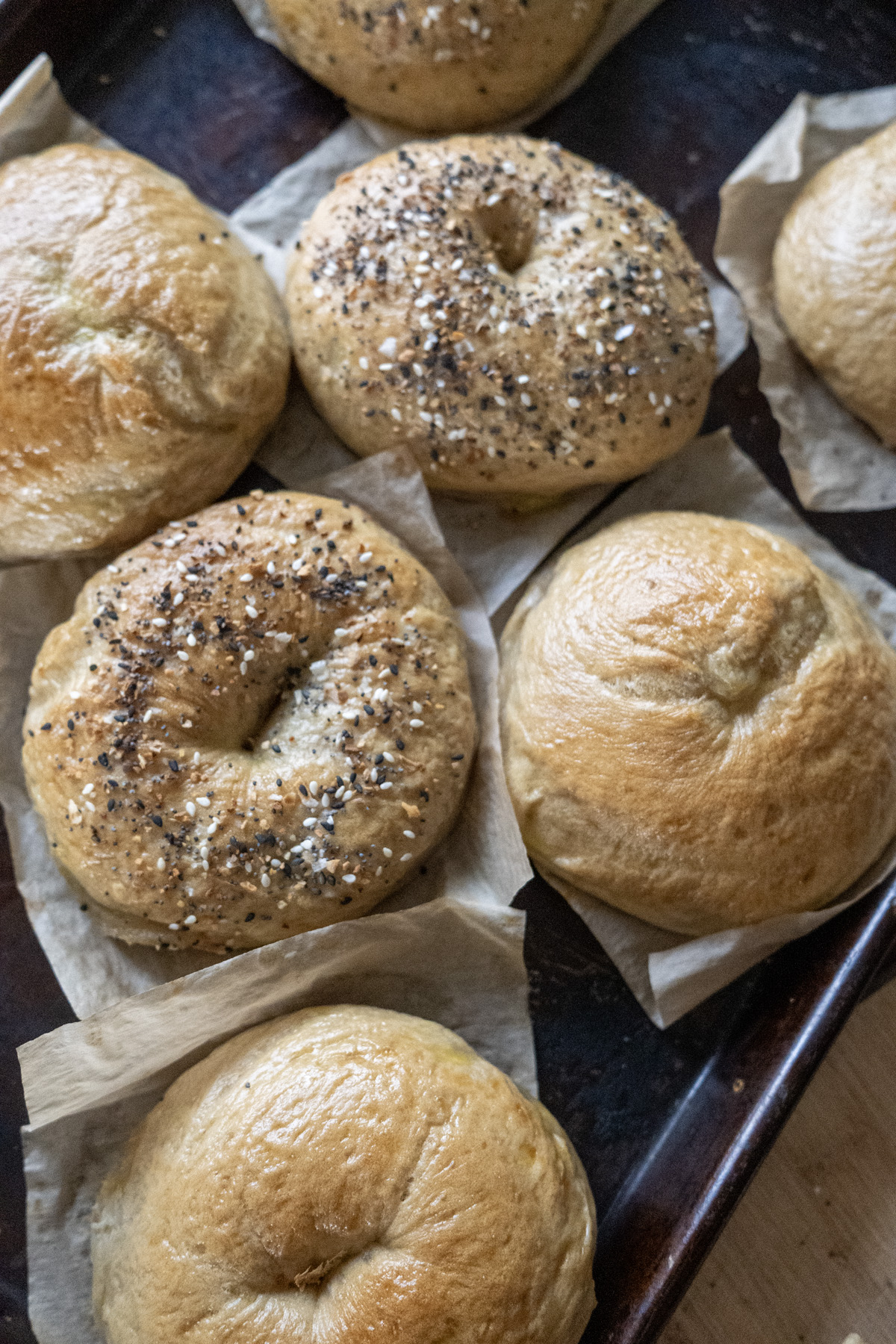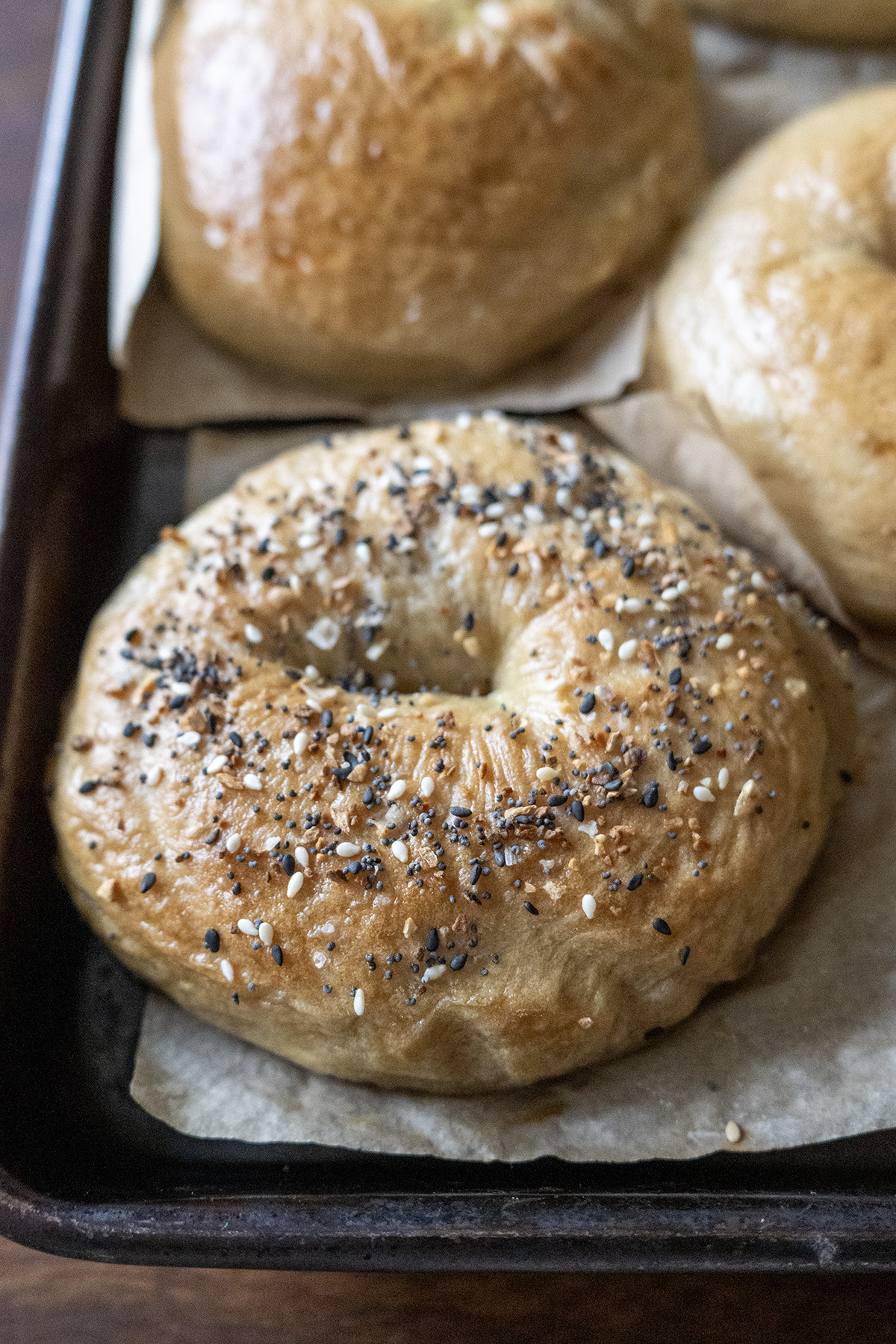- Everything Bagel Seasoning — Storebought or homemade blend (sesame seeds, poppy seeds, dried minced garlic, dried minced onion, flaky sea salt, and any special tweaks)! After boiling and with bagel still wet, sprinkle generously. You can also brush the bagel with an egg wash for a glossier finish and stronger adhesion.