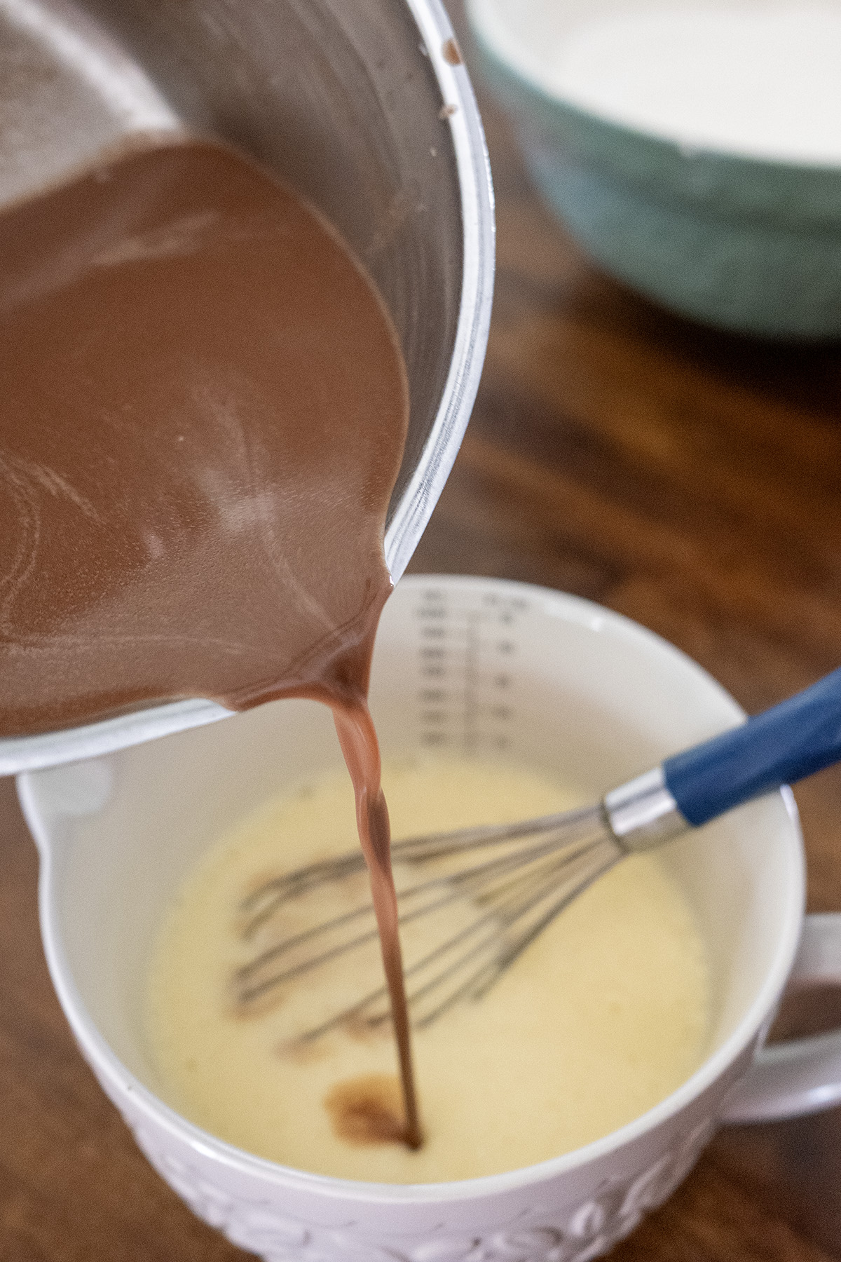 - In a separate bowl, whisk the 3 eggs, ⅔ cup buttermilk, and 1¼ teaspoons baking soda until smooth. To temper (recommended for extra safety): Add a small ladle (~¼ cup) of the warm cocoa mixture to the egg blend while whisking constantly. Repeat 2–3 times until the egg mixture feels warm. Then slowly pour in the remaining cocoa mixture while whisking vigorously.3 large eggs⅔ c. (160 g) buttermilk1¼ tsp baking soda