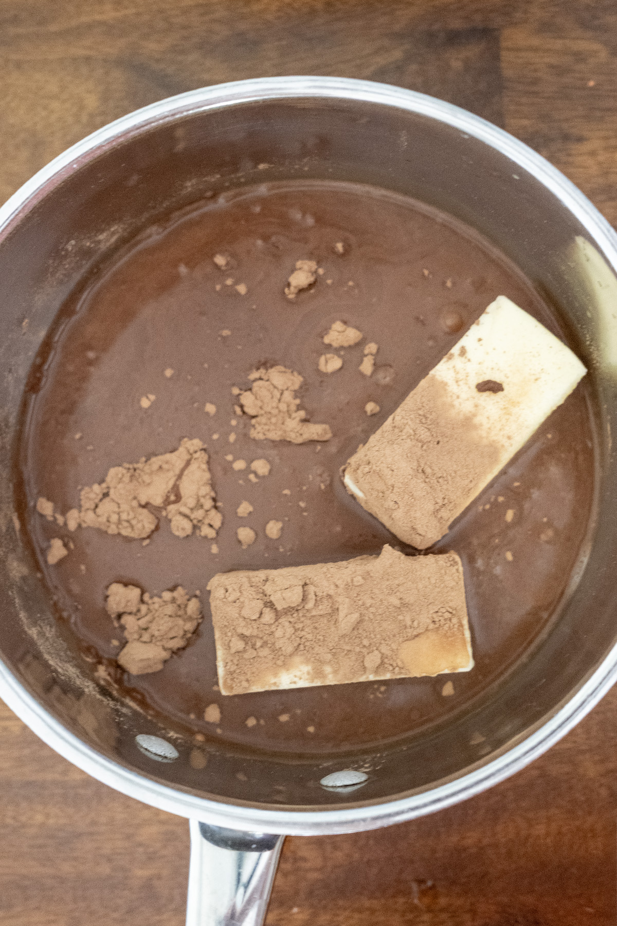 - In a medium saucepan over medium-low heat, melt the butter. Add the avocado oil, water, cocoa powder, and espresso powder (if using). Stir constantly until smooth and just steaming (2–3 minutes; do not boil). Remove from heat and cool slightly.½ c. (113 g) salted butter½ c. (110 g) avocado oil (or neutral oil)1¼ c. (300 g) water¼ c. (25 g) unsweetened cocoa powder½ tsp. espresso powder