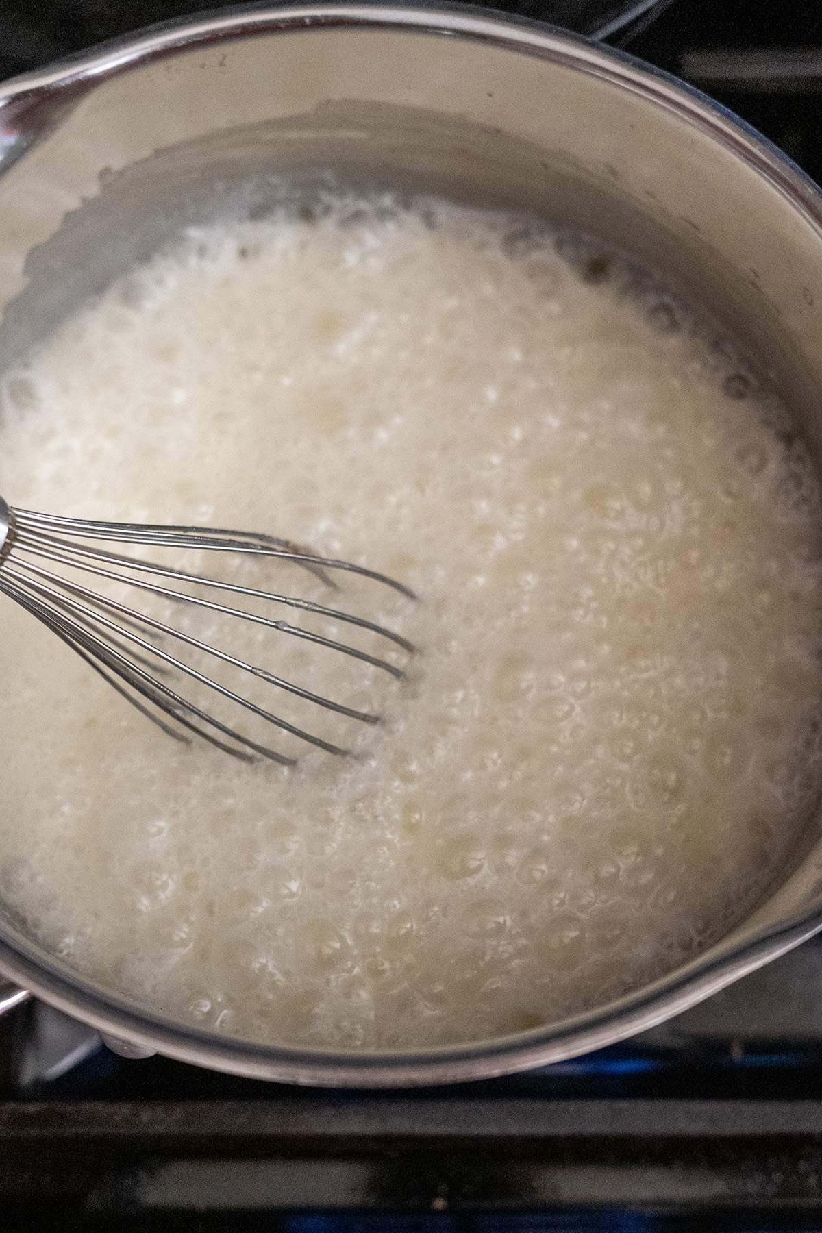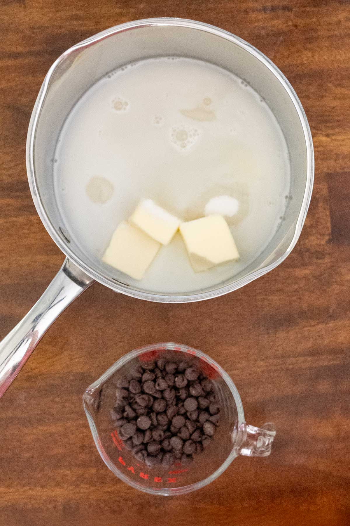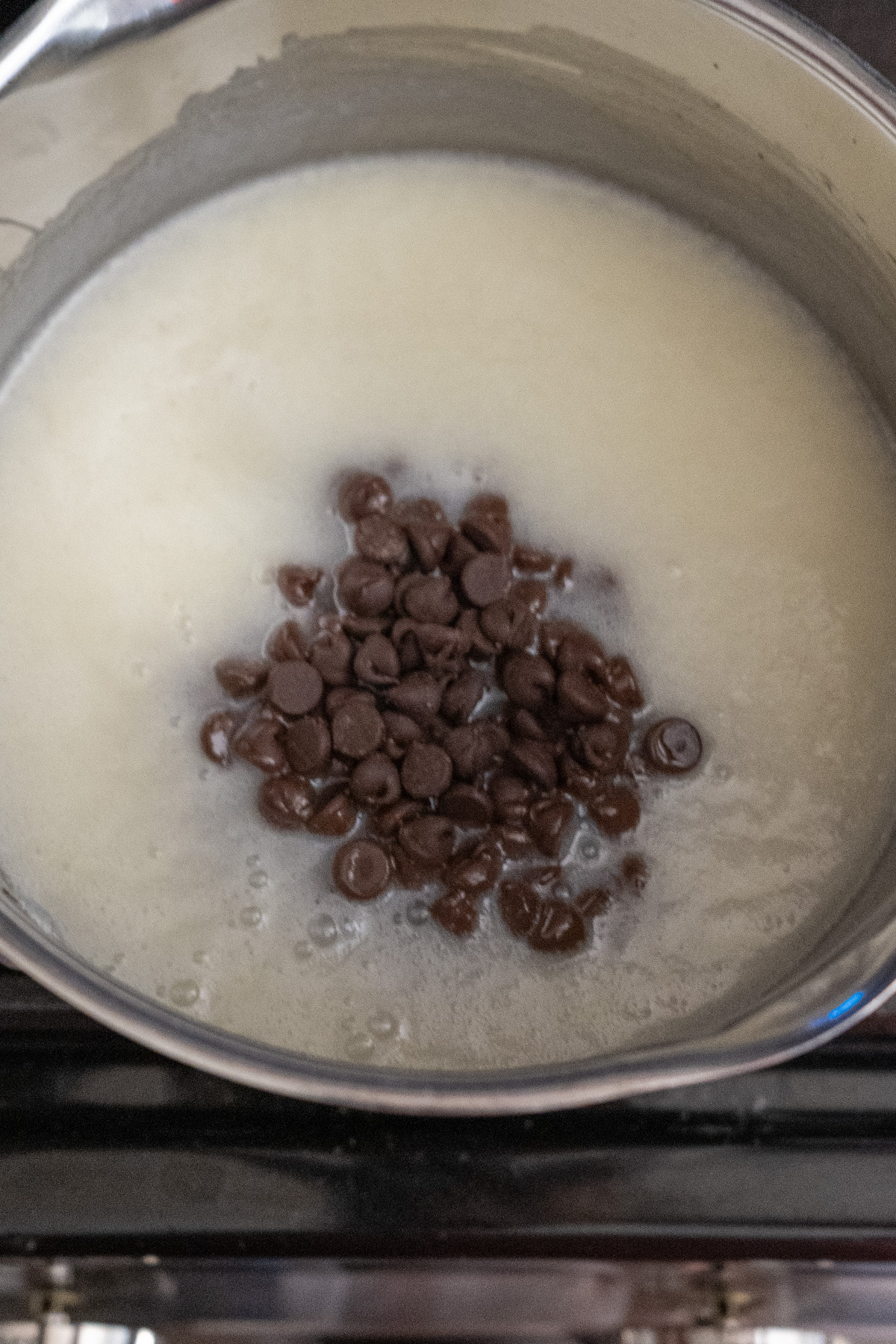 - In a medium saucepan, combine milk, sugar, and butter. Bring to a boil over medium heat, stirring constantly. Boil exactly 60 seconds, then remove from heat. Stir in chocolate chips until fully melted and smooth.⅓ c. (80 g) milk1½ c. (300 g) granulated sugar5 tbsp. (70 g) salted butter, softened¾ c. (130 g) semisweet chocolate chips