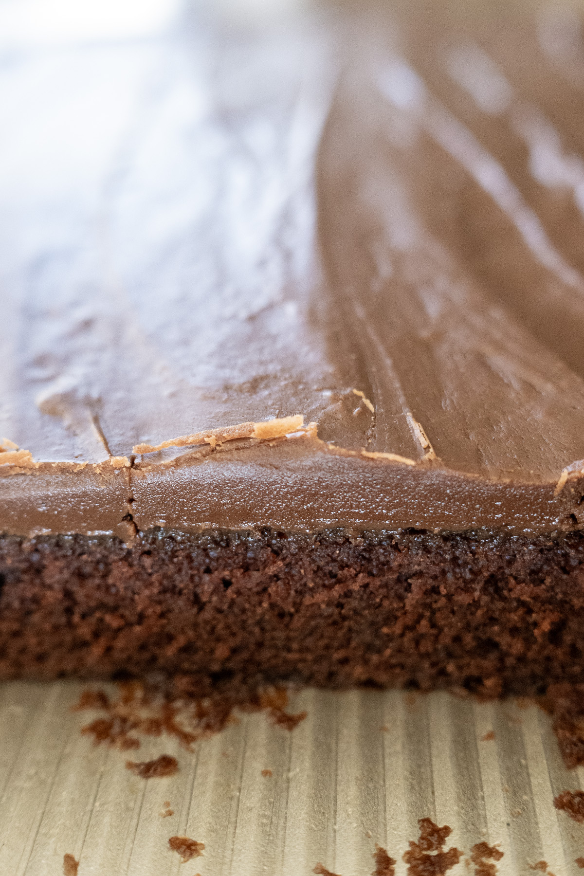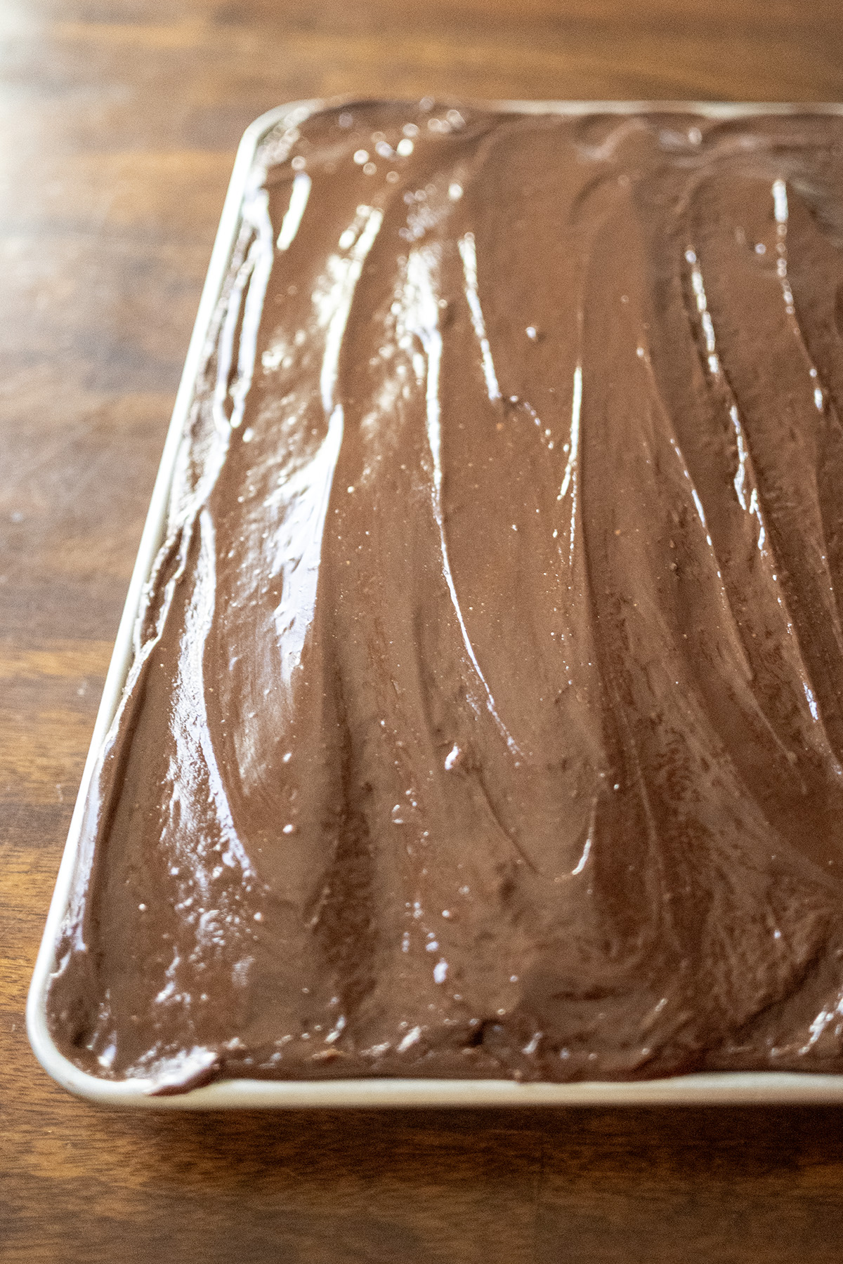 - Work quickly with the frosting—pour and spread within 1–2 minutes while it’s hot and fluid for that glossy, crackly finish. If it thickens mid-spread, gently re-warm over low heat for 10–15 seconds and limit spreading with a spatula. See my photo below where I got a little too aggressive with spreading the rapidly cooling frosting.