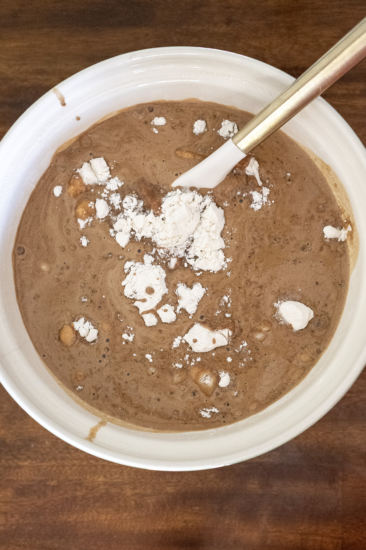 - Pour the wet mixture into the dry ingredients and whisk until smooth and no dry pockets remain. The batter will be thin and pourable. Pour into the prepared pan and spread evenly (should leave about ½ inch clearance from the top edge).