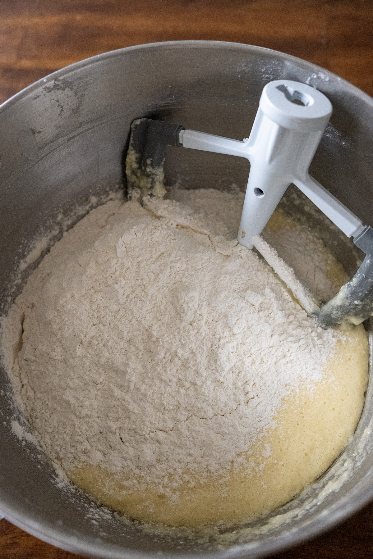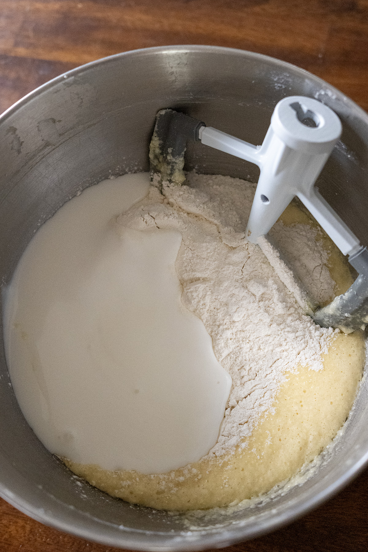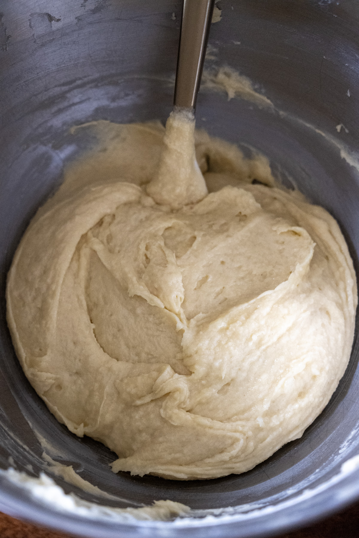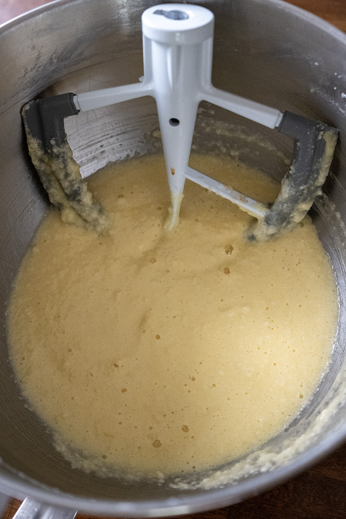 • Alternate adding the dry ingredients and sour cream (or buttermilk) to the creamed mixture, stirring just until combined. Do not overmix.