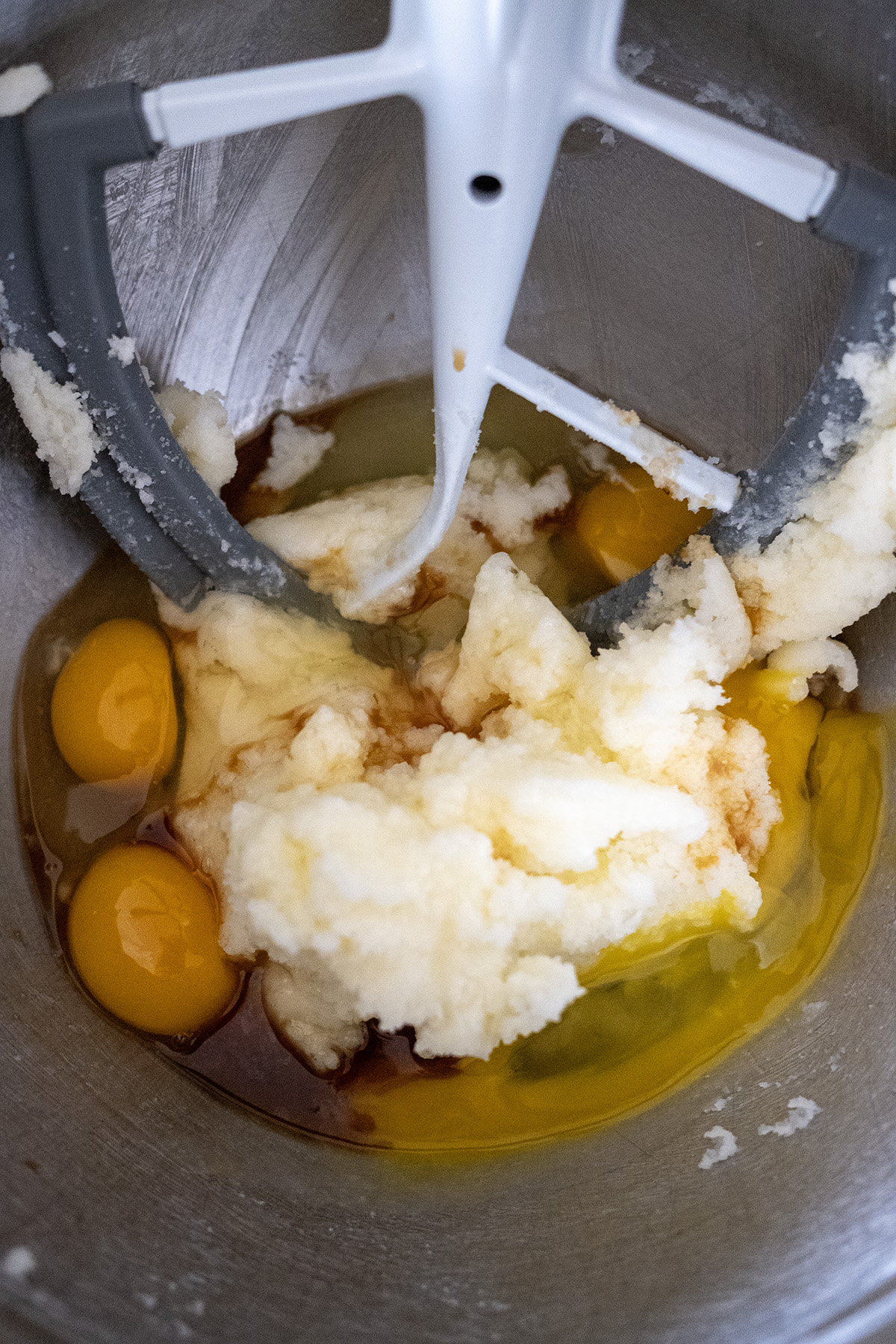• In a large bowl, cream the softened butter and sugar until light and fluffy. Beat in the eggs and vanilla extract.