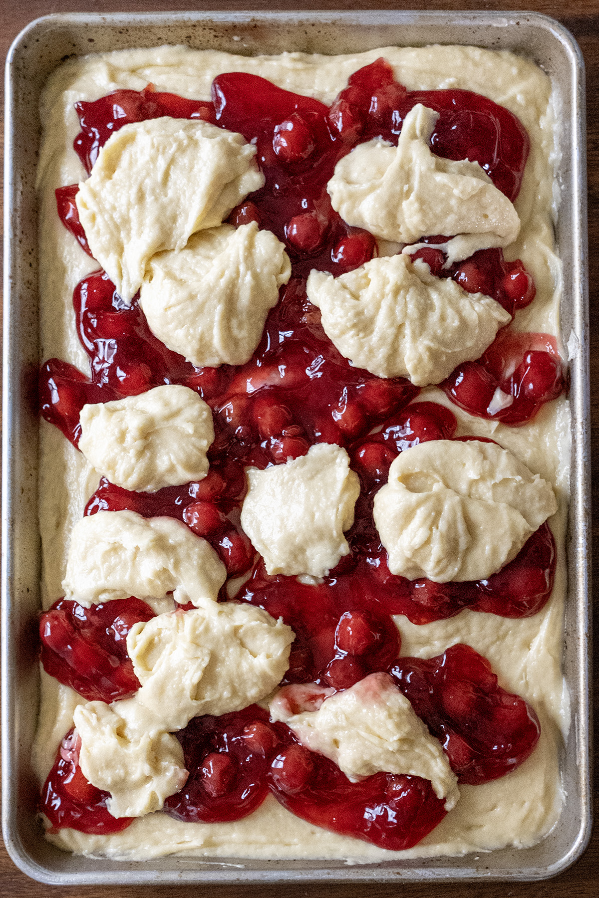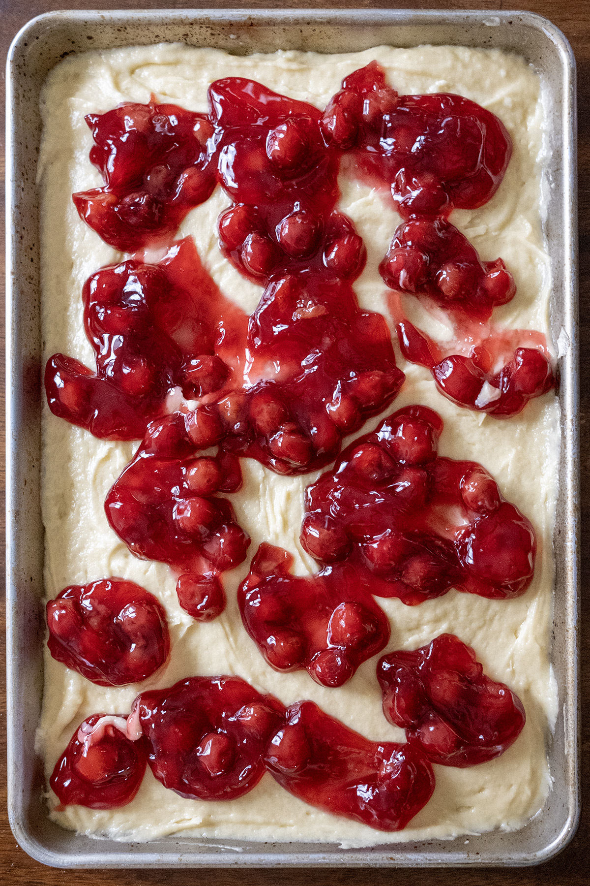 • Spread about ⅔ of the batter evenly into the prepared pan. Dollop the pie filling over the batter. Drop the remaining batter by spoonfuls on top. Gently swirl with a knife, leaving distinct pockets of fruit.