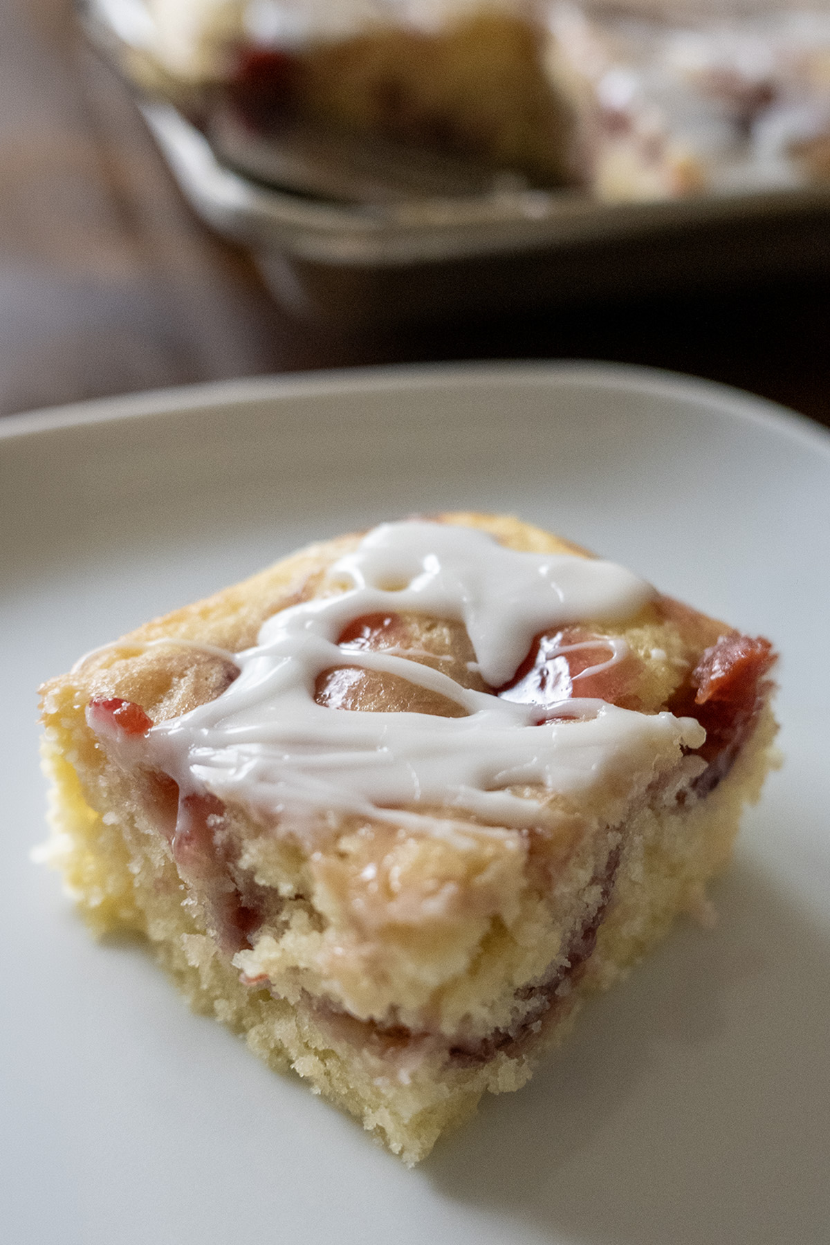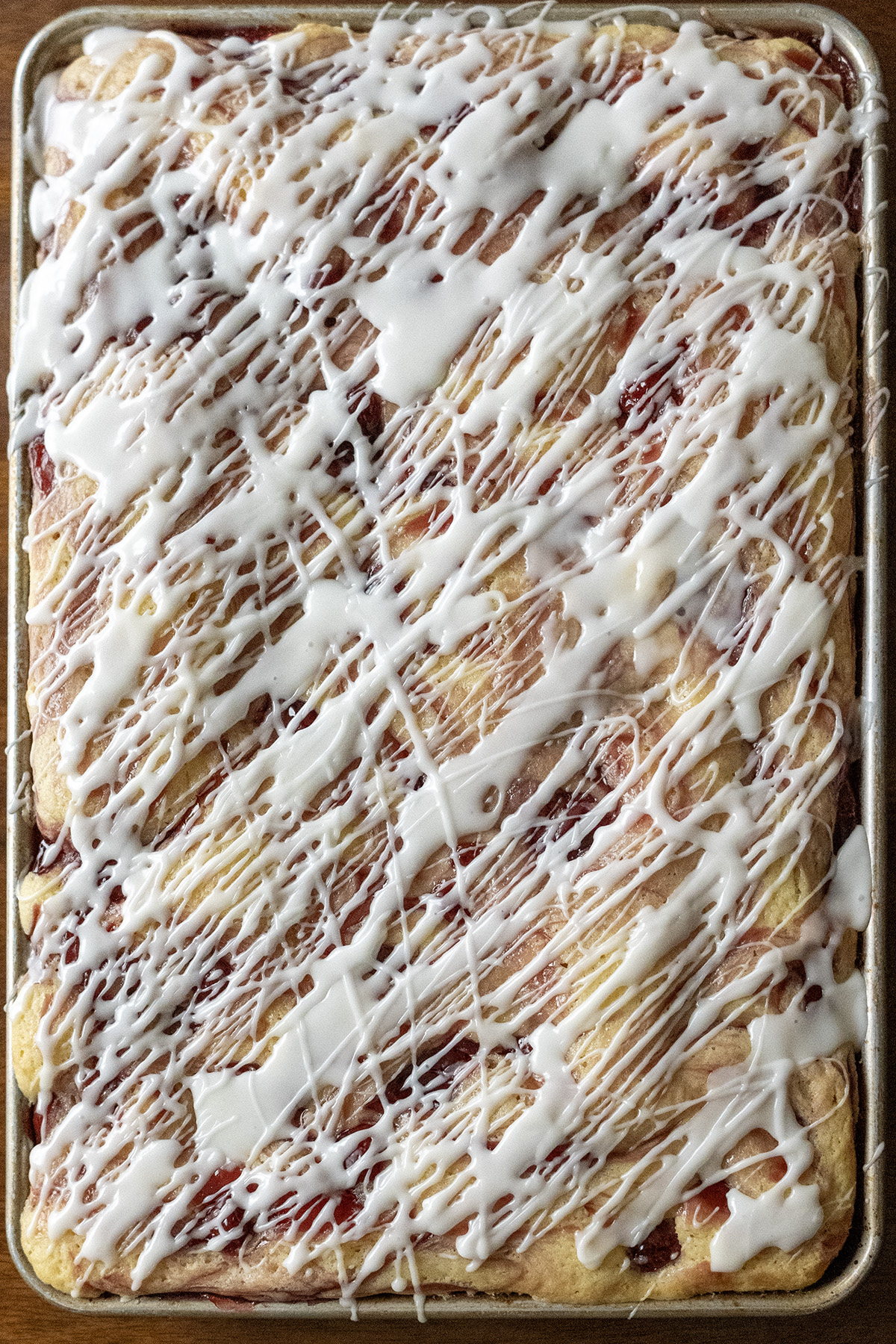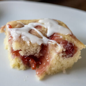 This coffee cake comes from my aunt. We’re not particularly close, but some family recipes are too good to keep to yourself. It bakes up beautifully in a 10×15-inch jelly roll pan, filling it generously with no spillage (but you may be tempted to hold your breath as it puffs up while it bakes). The crumb is moist and rich thanks to the sour cream (or buttermilk), and the pockets of pie filling swirled throughout make every bite fruity and scrumptious. I made the cherry version with an almond glaze, and it’s pure perfection. I’m also itching to develop a lemon blueberry version (and let’s be honest – all the other fruits as well). I’ll update this post with photos and details once I do.