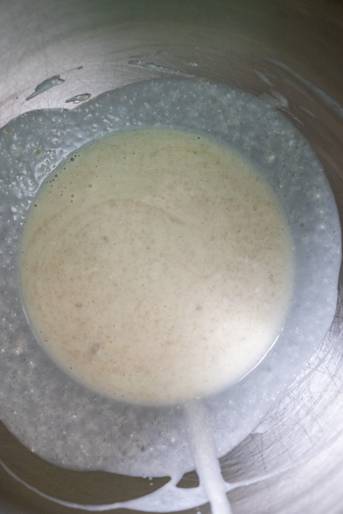 - Pour in the yeast mixture, 1½ tablespoons of honey, and the melted butter. Stir with a spatula or bread whisk, then gradually add the remaining flour until a rough ball of dough forms.