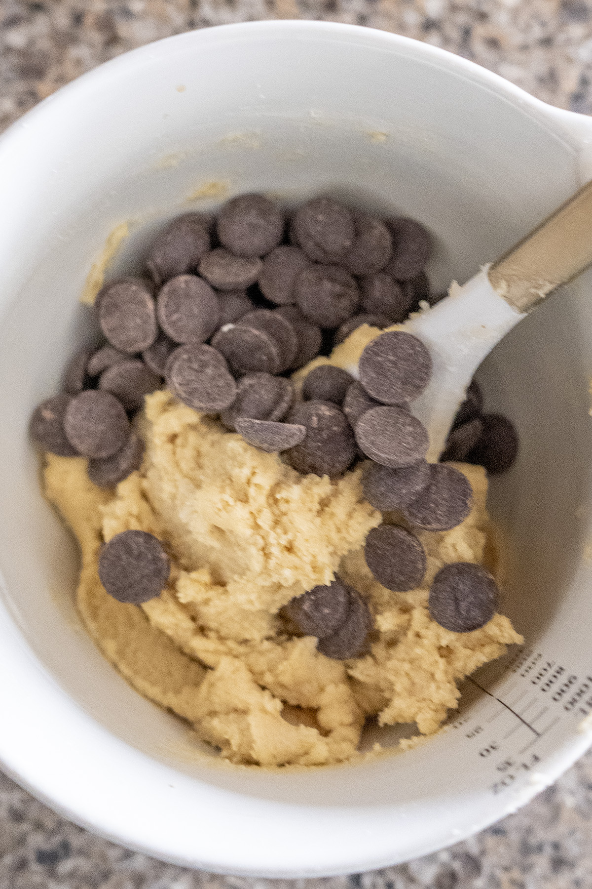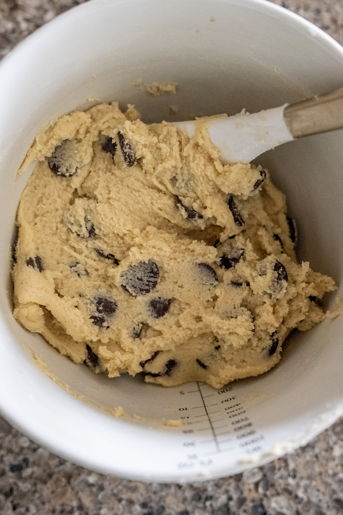 • Add the flour, baking soda, and salt to the bowl. Stir well until no dry streaks remain. Then stir in the chocolate chips.