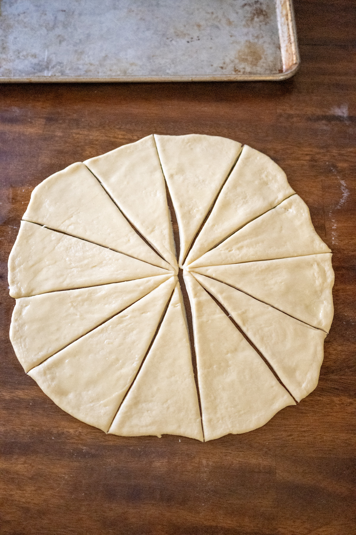 - Shape the Rolls: Punch down dough and divide into 24 equal pieces (use a kitchen scale). Shape into balls, knots, cloverleaf rolls, or crescents: For Crescents: Divide dough into 2 balls, rolling edges under to form smooth balls. On a lightly floured surface, roll one ball (smooth side down) into a ¼–½-inch thick circle (about 16 inches wide). Brush the rolled-out circle with some of the ¼ cup of melted butter. Cut into 4 quarters with a pizza cutter, then cut each quarter into 3 triangles (12 total). Roll each triangle from the wide end to the point, tucking the point under. Repeat with the second ball.¼ cup (57 g) salted butter