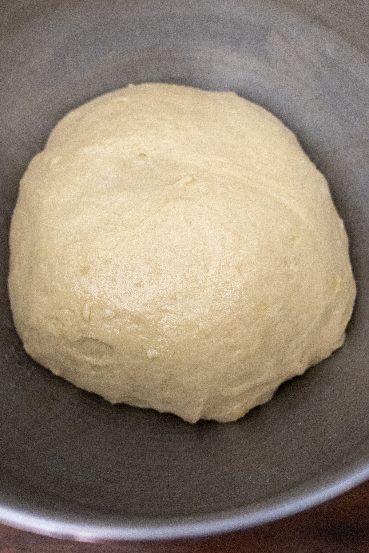 - Mix the Dough: In a large bowl or stand mixer, combine potato mixture, softened butter, sugar, salt, and eggs. Mix until smooth. Gradually add flour, mixing until a soft dough forms. Knead on a lightly floured surface or with a dough hook for 5–7 minutes, adding flour as needed for a smooth and slightly tacky dough.6 tbsp (85 g) salted butter6 tbsp (75 g) granulated sugar1 ½ tsp salt2 large eggs5 cups (625 g) unbleached all-purpose flour (RECOMMEND WEIGHING)
