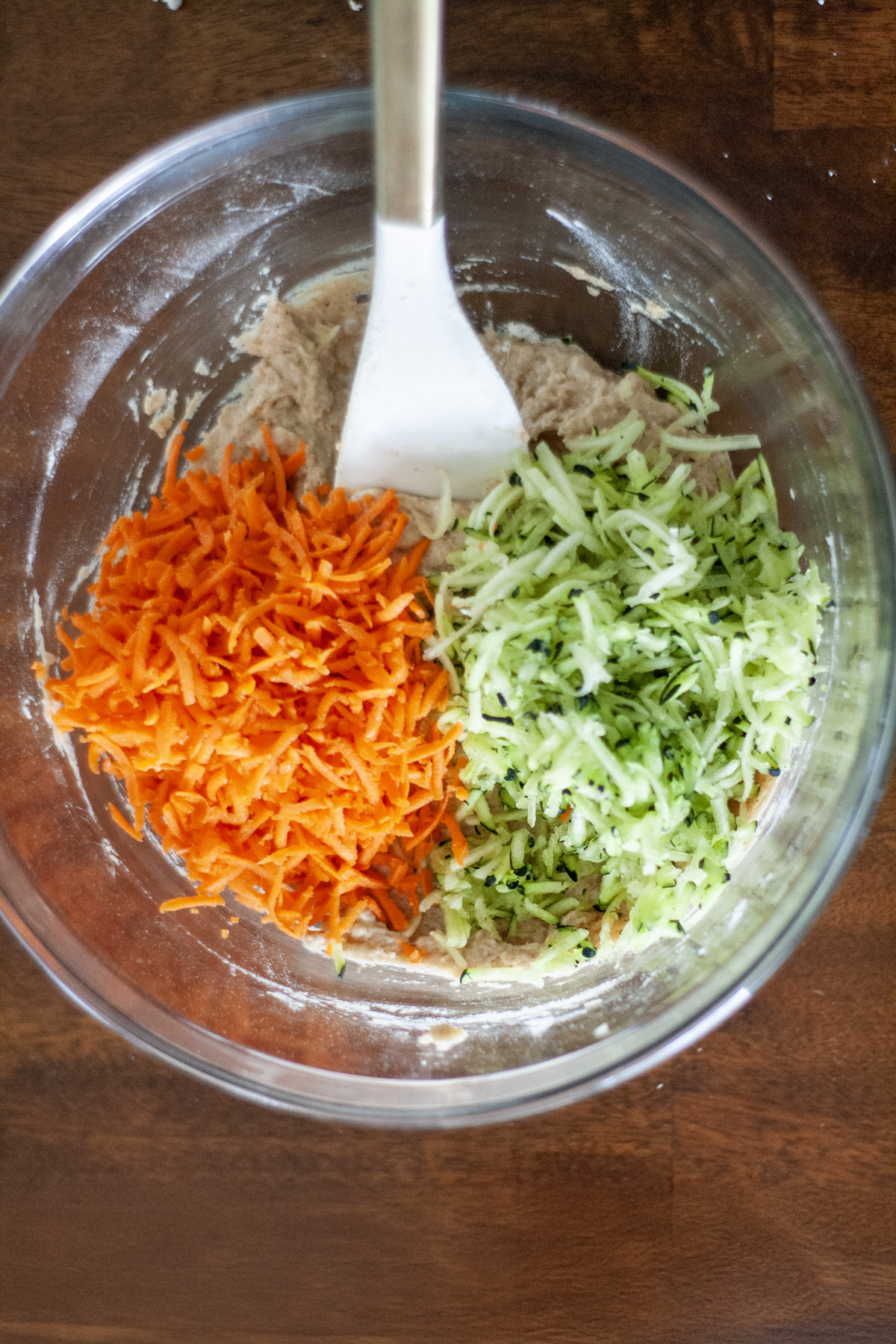 • Fold in Veggies: Gently fold in the grated zucchini and carrots until evenly distributed.