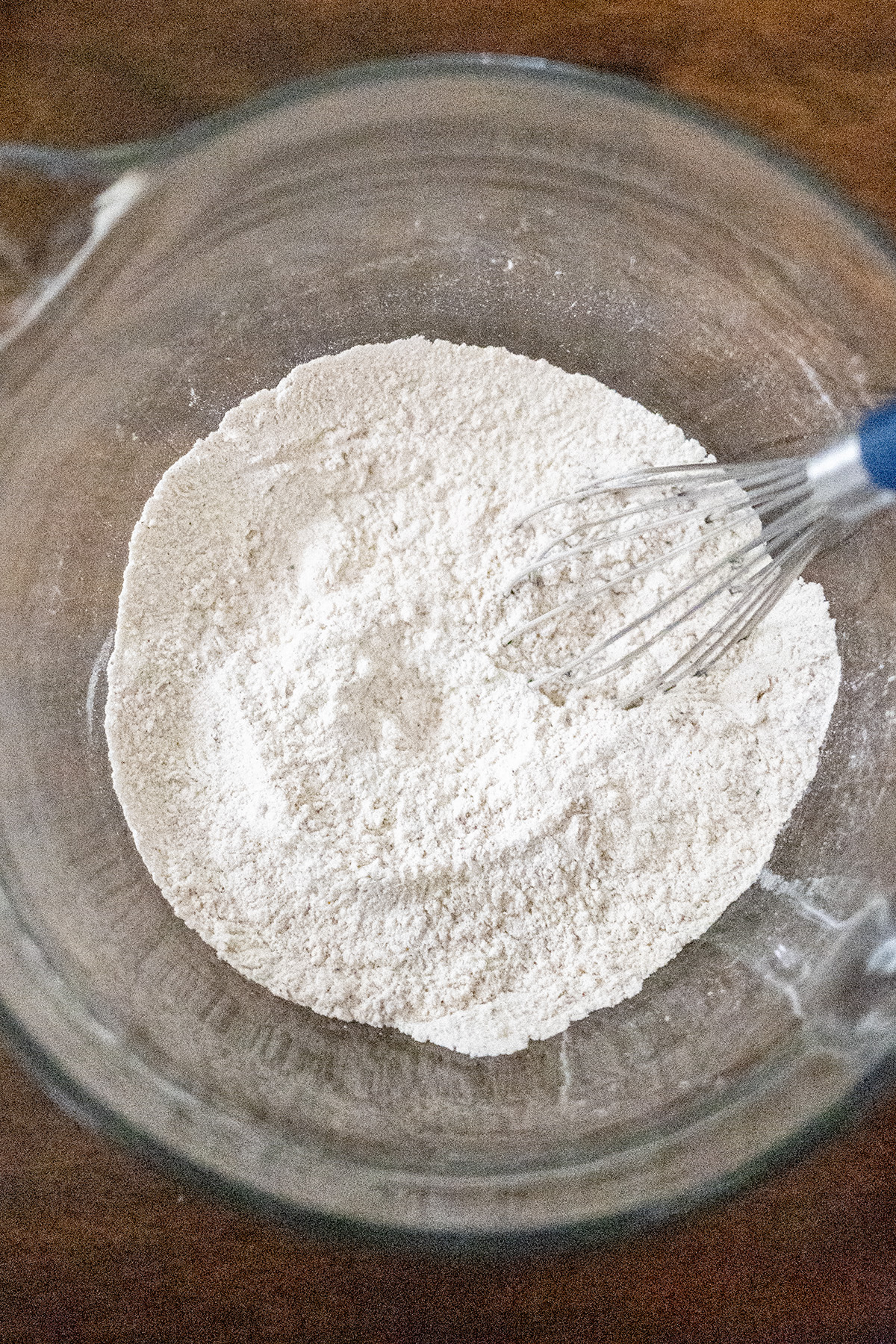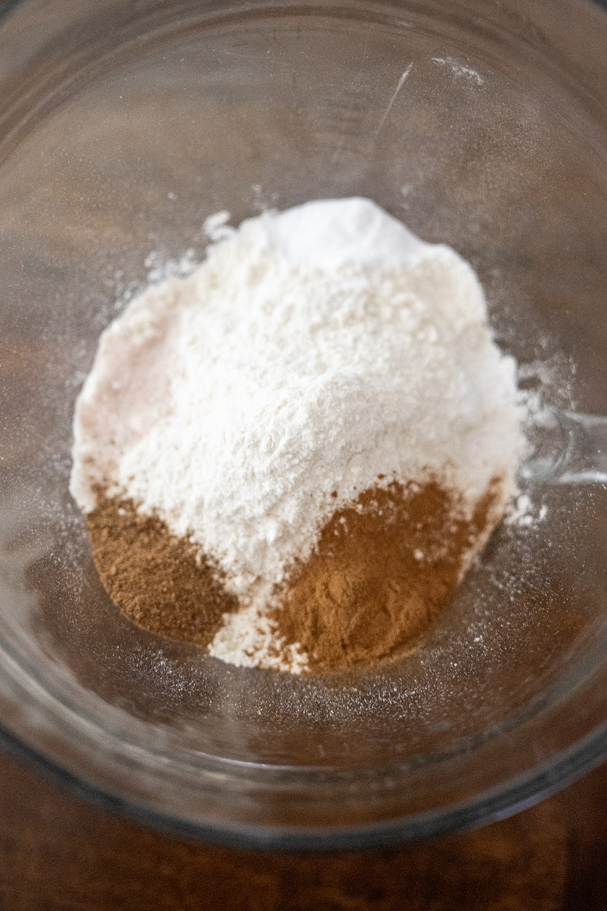 • Mix Dry Ingredients: In a large bowl, whisk together flour, baking powder, baking soda, salt, cinnamon, nutmeg (if using), and granulated sugar.