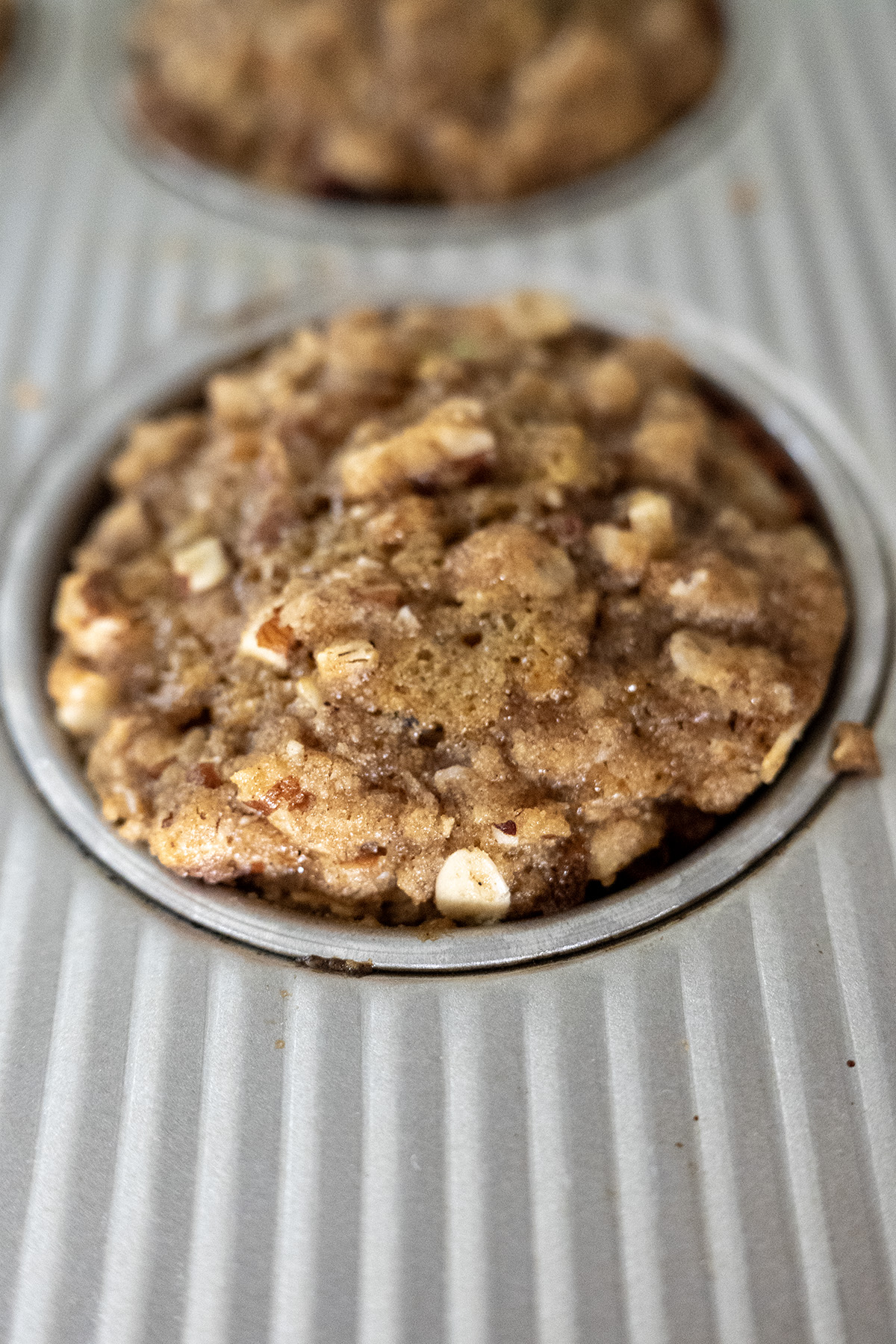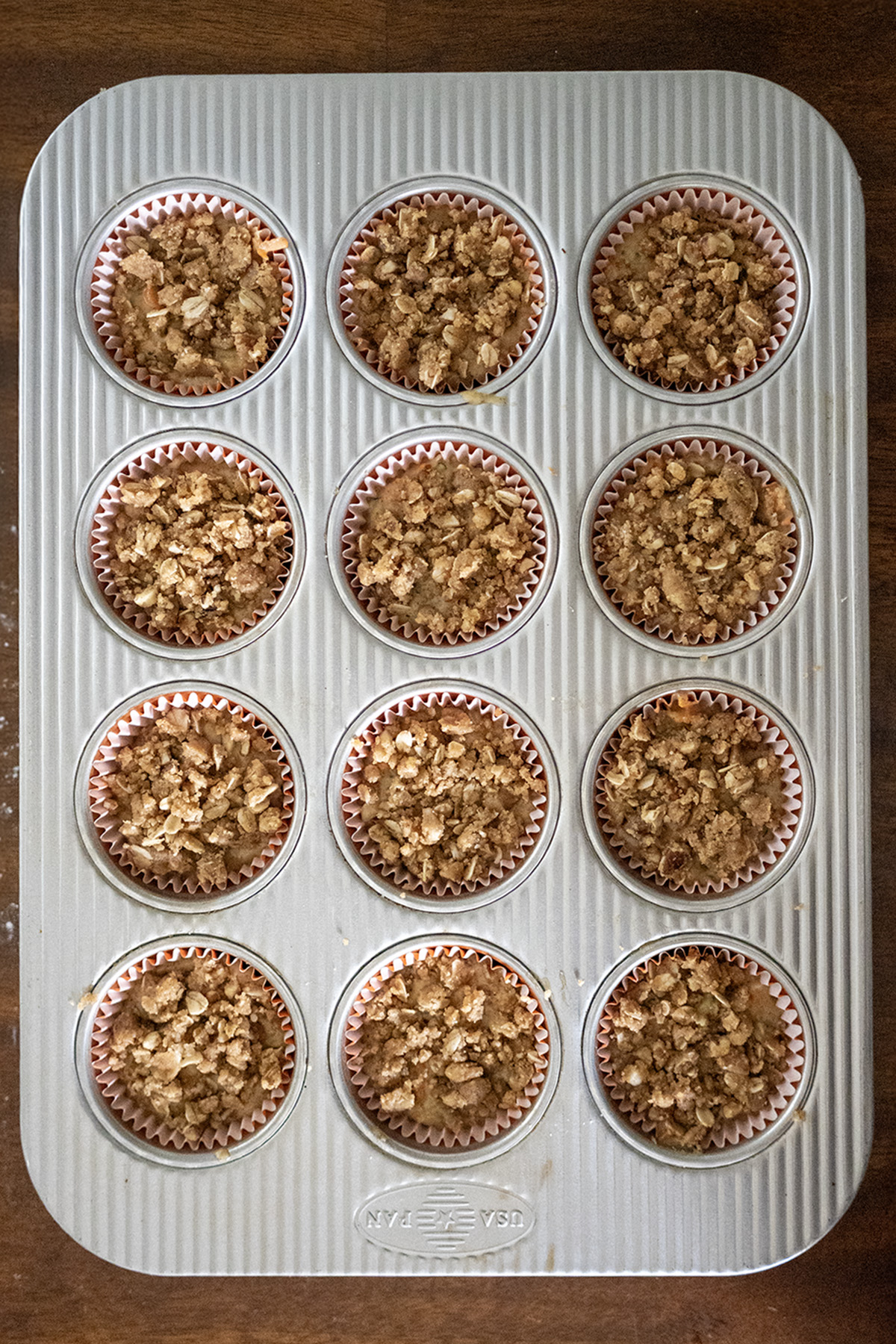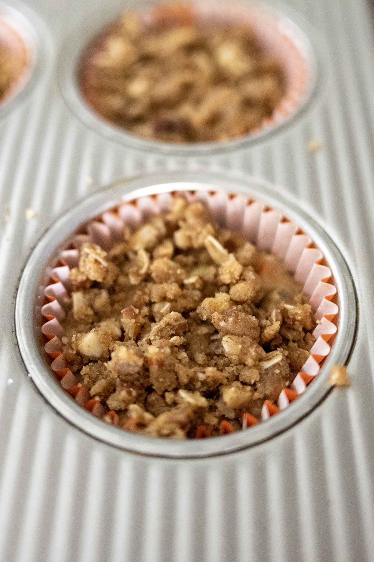 • Fill the Muffin Tin: Divide the batter evenly among the 12 muffin cups, filling each about ¾ full. Sprinkle 1-2 tsp of streusel topping over each muffin, pressing lightly to help it stick.