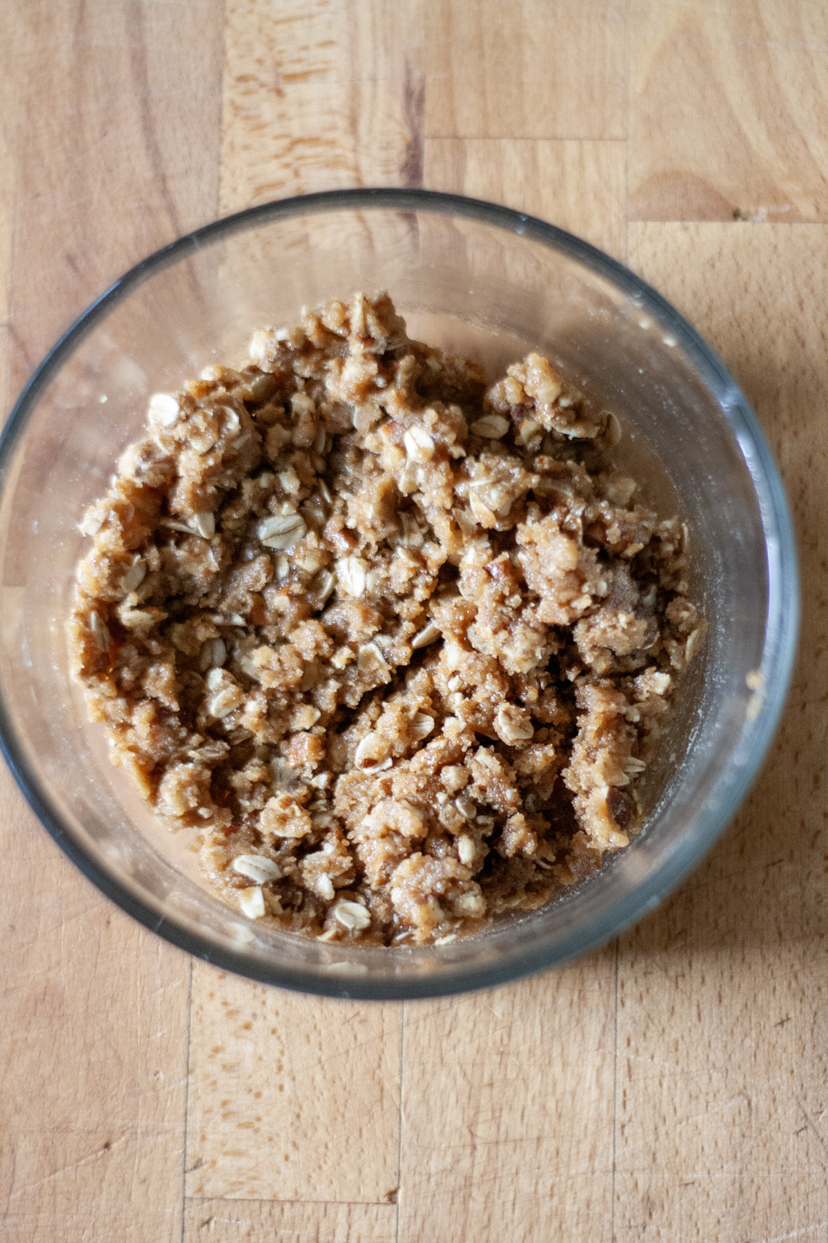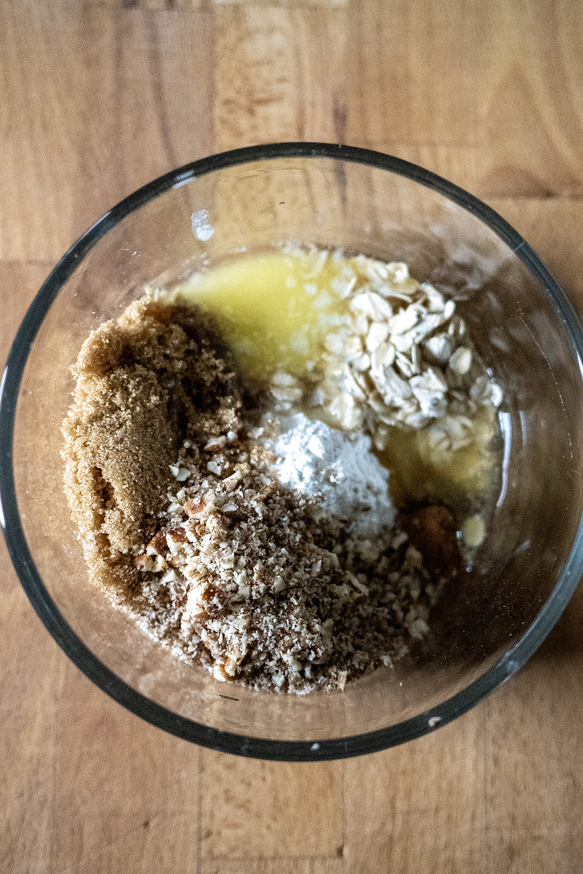 • Make the Streusel: In a small bowl, combine flour, brown sugar, rolled oats, and cinnamon. Stir in melted butter until the mixture forms coarse crumbs. Add chopped nuts if you’d like extra crunch. Set aside.